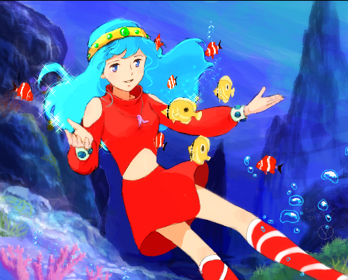 1girl air_bubble blue_eyes blue_hair bubble butterflyfish clothing_cutout clownfish commentary coral elfie fish gem gold_headband green_gem headband jewelry kneehighs long_hair lowres necklace red_shirt red_skirt red_socks sakai_yume sango-shou_densetsu:_aoi_umi_no_elfie seafloor shirt shoulder_cutout signature skirt socks solo turtleneck turtleneck_shirt underwater