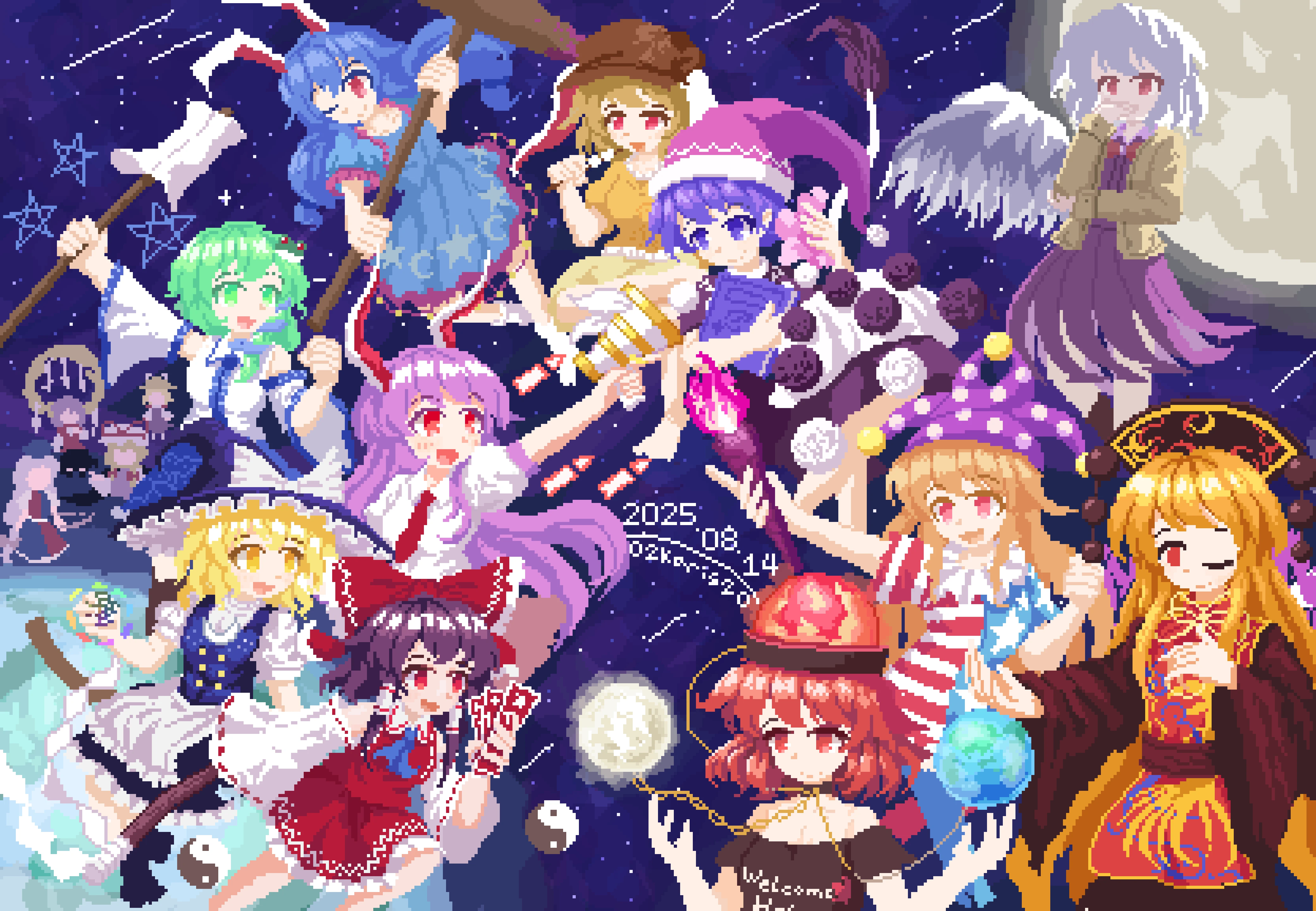 02charaice20 6+girls absurdres american_flag american_flag_dress american_flag_print animal_ears anniversary apron artist_name ascot black_dress black_hat black_shirt blonde_hair blue_ascot blue_dress blue_hat blue_vest bow bowtie braid broom broom_riding brown_hair brown_hat chain chinese_commentary closed_mouth clothes_writing clownpiece collared_shirt commentary_request covering_own_mouth crescent_print dalachi_(headdress) dango dated detached_sleeves doremy_sweet dream_soul dress earth_(ornament) earth_(planet) flag_print floppy_ears food frilled_bow frills frog_hair_ornament gohei gold_chain green_eyes green_hair grey_hair hair_bow hair_ornament hair_tubes hakurei_reimu hat hat_bow hat_ribbon hecatia_lapislazuli highres holding holding_gohei holding_mallet holding_torch jacket jester_cap junko_(touhou) kine kirisame_marisa kishin_sagume kochiya_sanae legacy_of_lunatic_kingdom long_hair long_sleeves lunatic_gun mallet mob_cap moon moon_(ornament) moriya_suwako multiple_girls neck_ribbon neck_ruff necktie nurse_cap off-shoulder_shirt off_shoulder ofuda one_eye_closed open_clothes open_jacket open_mouth orange_shirt orb phoenix_print pink_skirt pixel_art planet polka_dot_headwear pom_pom_(clothes) purple_dress purple_hair purple_hat purple_tabard rabbit_ears rabbit_girl red_bow red_bowtie red_eyes red_hair red_necktie red_skirt red_tabard reisen_udongein_inaba ribbon ribbon-trimmed_sleeves ribbon_trim ringo_(touhou) rope seiran_(touhou) shimenawa shirt shorts single_wing skewer skirt skirt_set smile snake_hair_ornament space star_(symbol) star_print striped_clothes striped_dress suit_jacket tabard tail tapir_tail torch touhou underworld_(ornament) very_long_hair vest wagashi waist_apron white_apron white_shirt white_wings wide_sleeves wings witch_hat yagokoro_eirin yakumo_yukari yasaka_kanako yellow_eyes yellow_ribbon yellow_shorts yin_yang yin_yang_orb