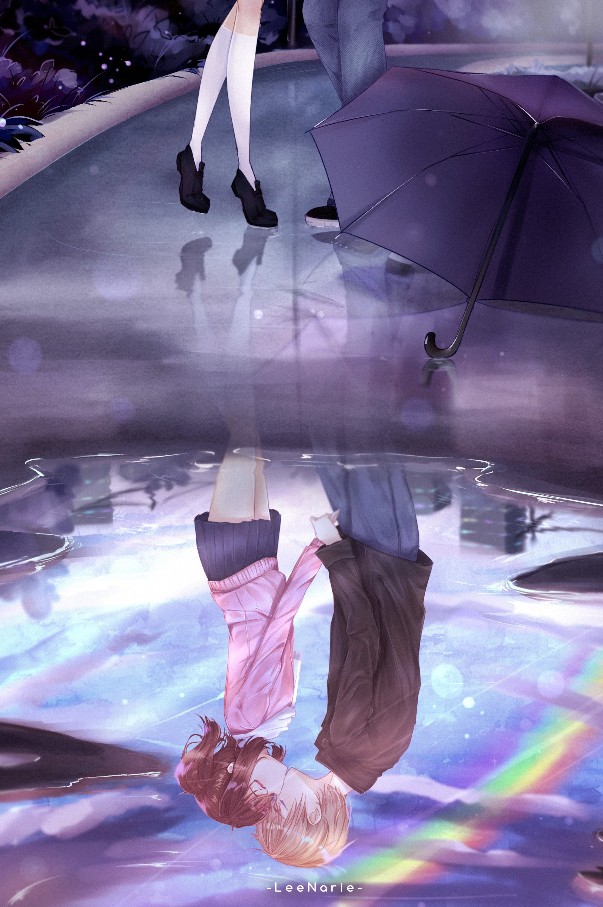 1boy 1girl absurdres artist_name blonde_hair brown_hair closed_eyes commentary_request couple flower highres holding_hands jacket kiss kneehighs leenarie lens_flare loafers original out_of_frame outdoors ponytail profile puddle rainbow reflection reflective_liquid road shoes short_hair socks street umbrella water white_socks