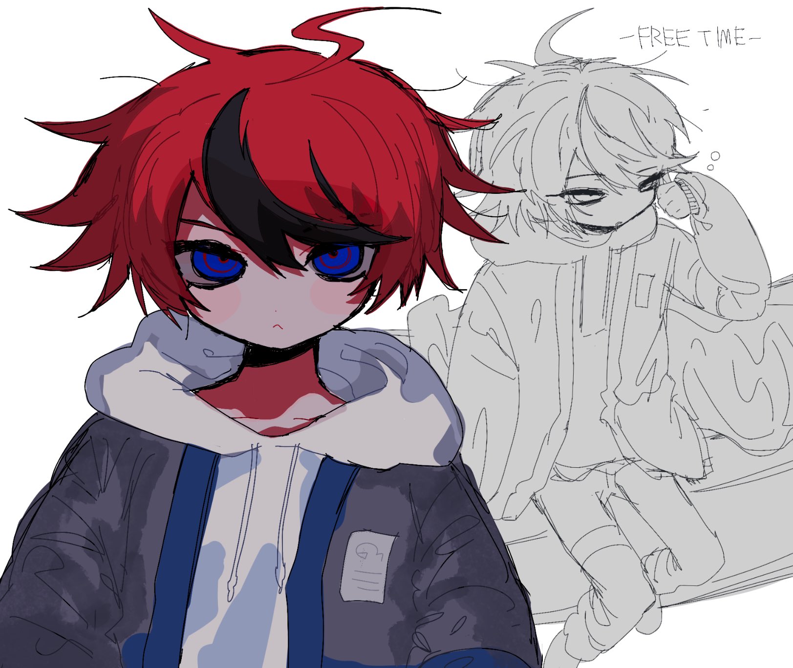 1boy ahoge black_hair blue_eyes blue_jacket blush_stickers closed_mouth drawstring english_text frown grey_jacket highres hood hood_down hoodie jacket jacket_over_hoodie long_sleeves male_focus messy_hair multicolored_hair multicolored_jacket multiple_views open_clothes open_jacket red_hair short_hair simple_background sitting sleeves_past_wrists streaked_hair sumino_takumi the_hundred_line_-last_defense_academy- two-tone_hair two-tone_jacket waai_(wa_i100hdl) white_background white_hoodie