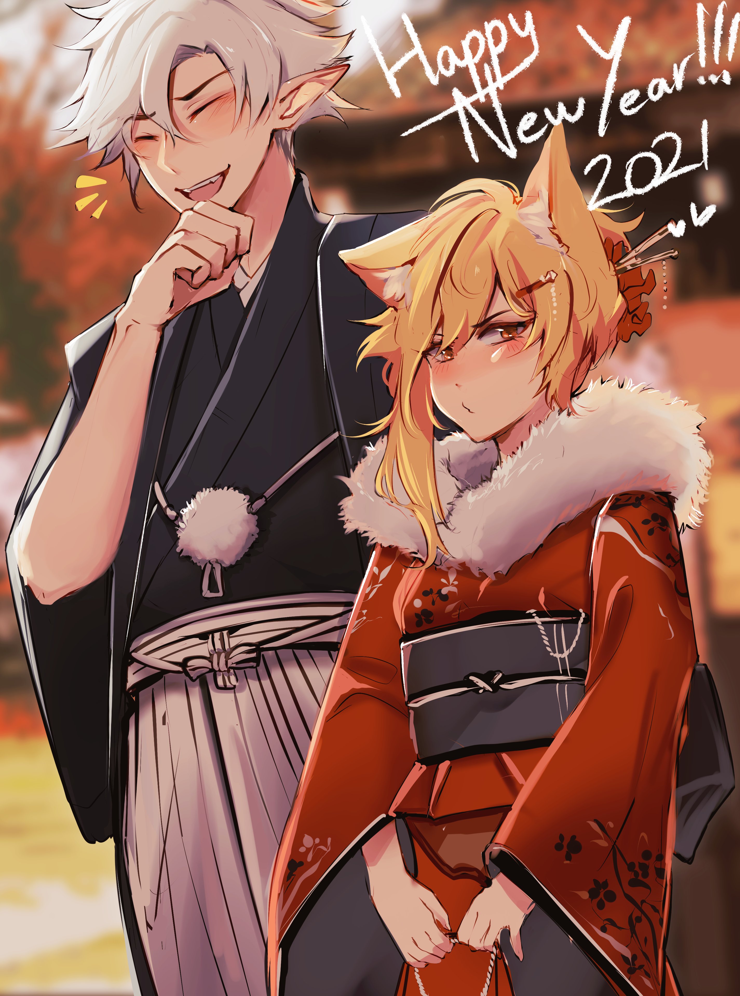 1boy 1girl 1hp_club absurdres alice_(1hp_club) animal_ears averting_eyes black_kimono blonde_hair blurry blurry_background cat_ears chopsticks commentary double-parted_bangs elfboiii english_commentary english_text facing_viewer fangs fur_collar hair_between_eyes hair_bun hair_ornament hairclip hand_on_own_chin happy_new_year highres holding holding_rope japanese_clothes kimono laughing new_year notice_lines obi_(1hp_club) outdoors pointy_ears red_kimono rope short_hair single_sidelock upper_body white_hair wide_sleeves