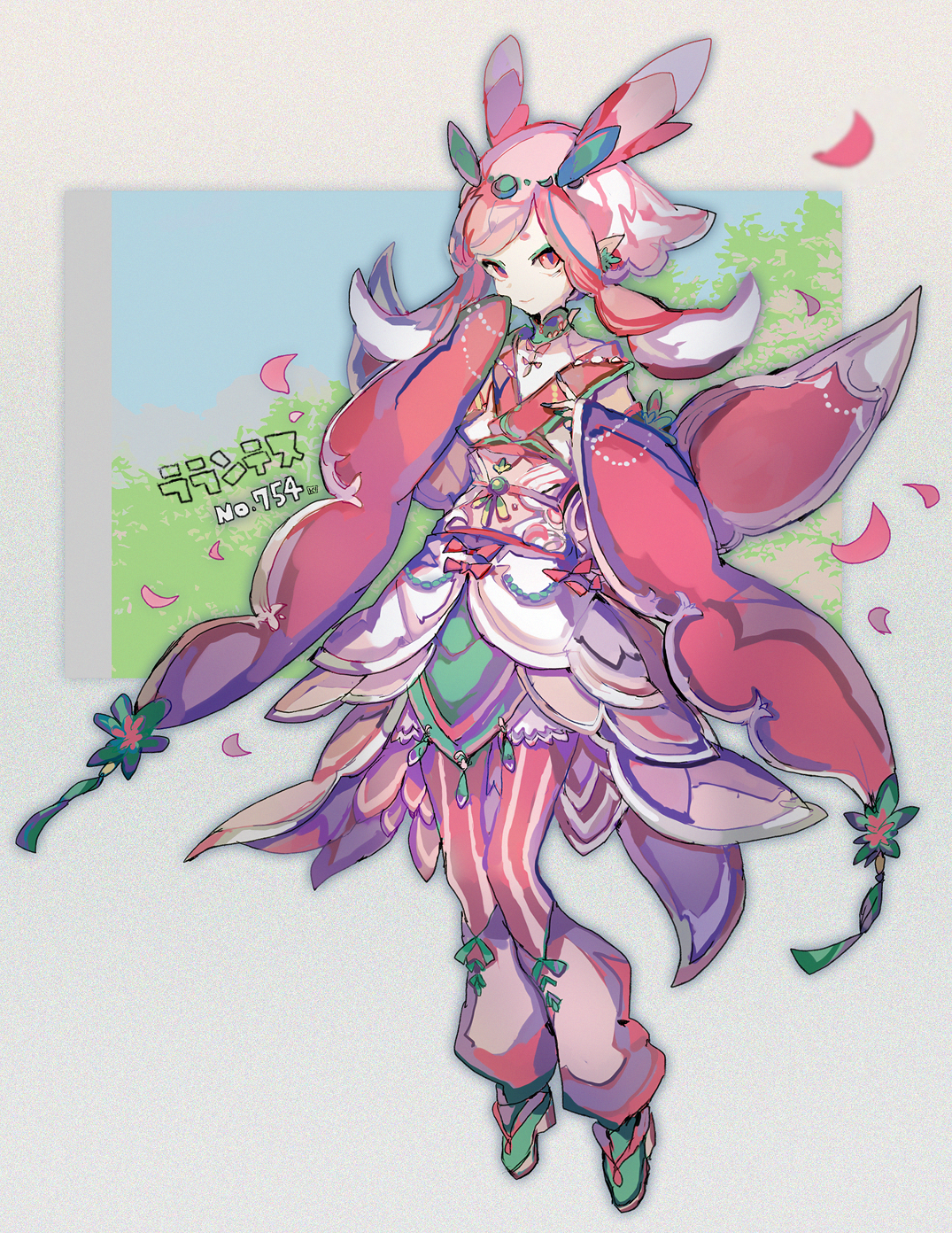1girl character_name closed_mouth commentary_request full_body gen_7_pokemon grey_background highres humanization kantarou_(8kan) looking_at_viewer lurantis nintendo pantyhose pink_hair pointy_ears pokedex_number pokemon red_eyes short_hair_with_long_locks solo standing striped_clothes striped_pantyhose vertical-striped_clothes vertical-striped_pantyhose wide_sleeves