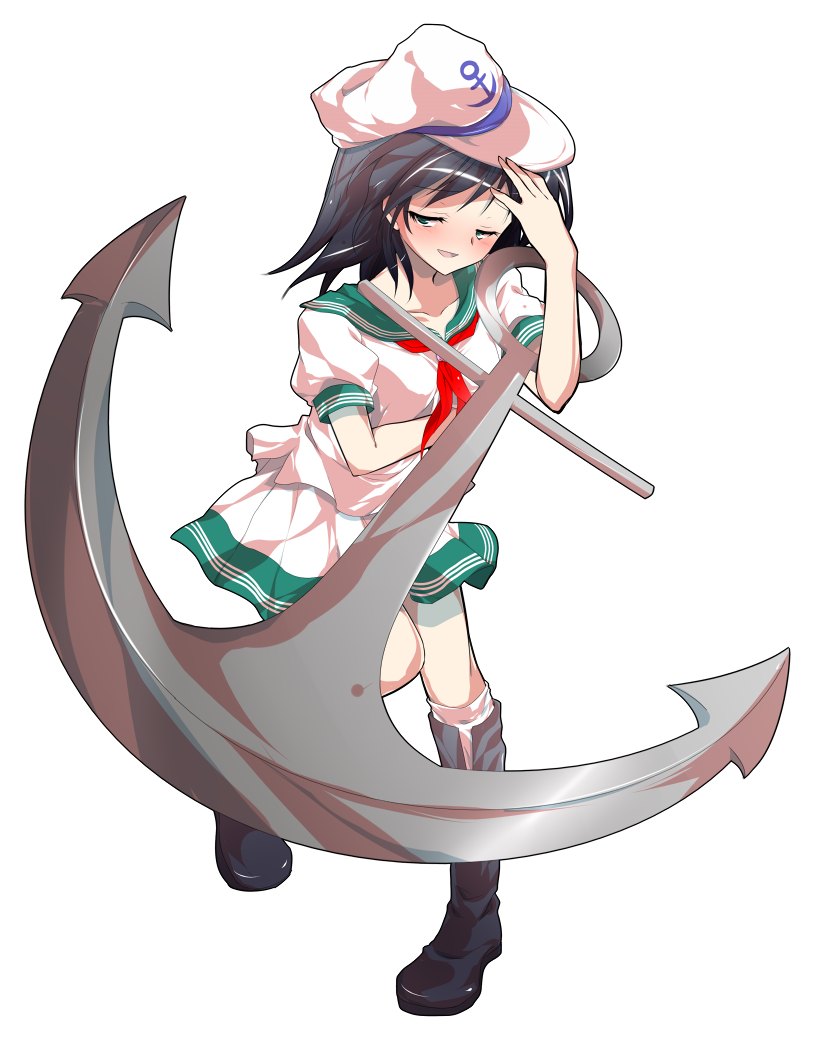 1girl alphes_(style) anchor anchor_symbol arm_up black_boots black_hair blush boots collarbone commentary_request dairi full_body green_eyes green_sailor_collar half-closed_eyes hand_on_own_head hat holding holding_anchor knee_boots kneehighs large_variant_set looking_at_viewer medium_hair miniskirt murasa_minamitsu neckerchief parody parted_lips pleated_skirt print_hat puffy_short_sleeves puffy_sleeves red_neckerchief sailor_collar shirt short_sleeves simple_background skirt socks solo standing standing_on_one_leg style_parody tachi-e touhou transparent_background variant_set white_hat white_shirt white_skirt white_socks