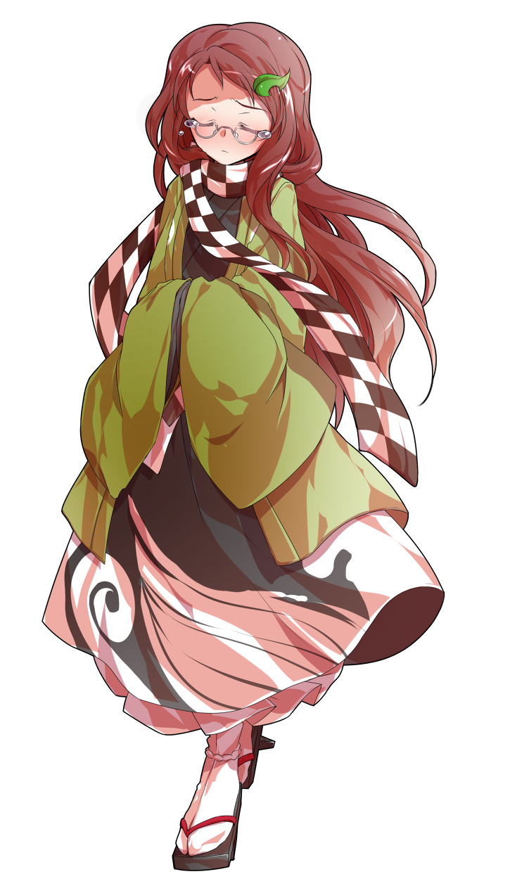 1girl alphes_(style) black_sandals blush brown_hair commentary_request dairi full_body futatsuiwa_mamizou futatsuiwa_mamizou_(human) geta glasses hair_ornament hands_in_opposite_sleeves haori highres japanese_clothes large_variant_set leaf_hair_ornament parody sandals scarf socks solo style_parody tabi tachi-e touhou transparent_background variant_set walking white_socks wide_sleeves