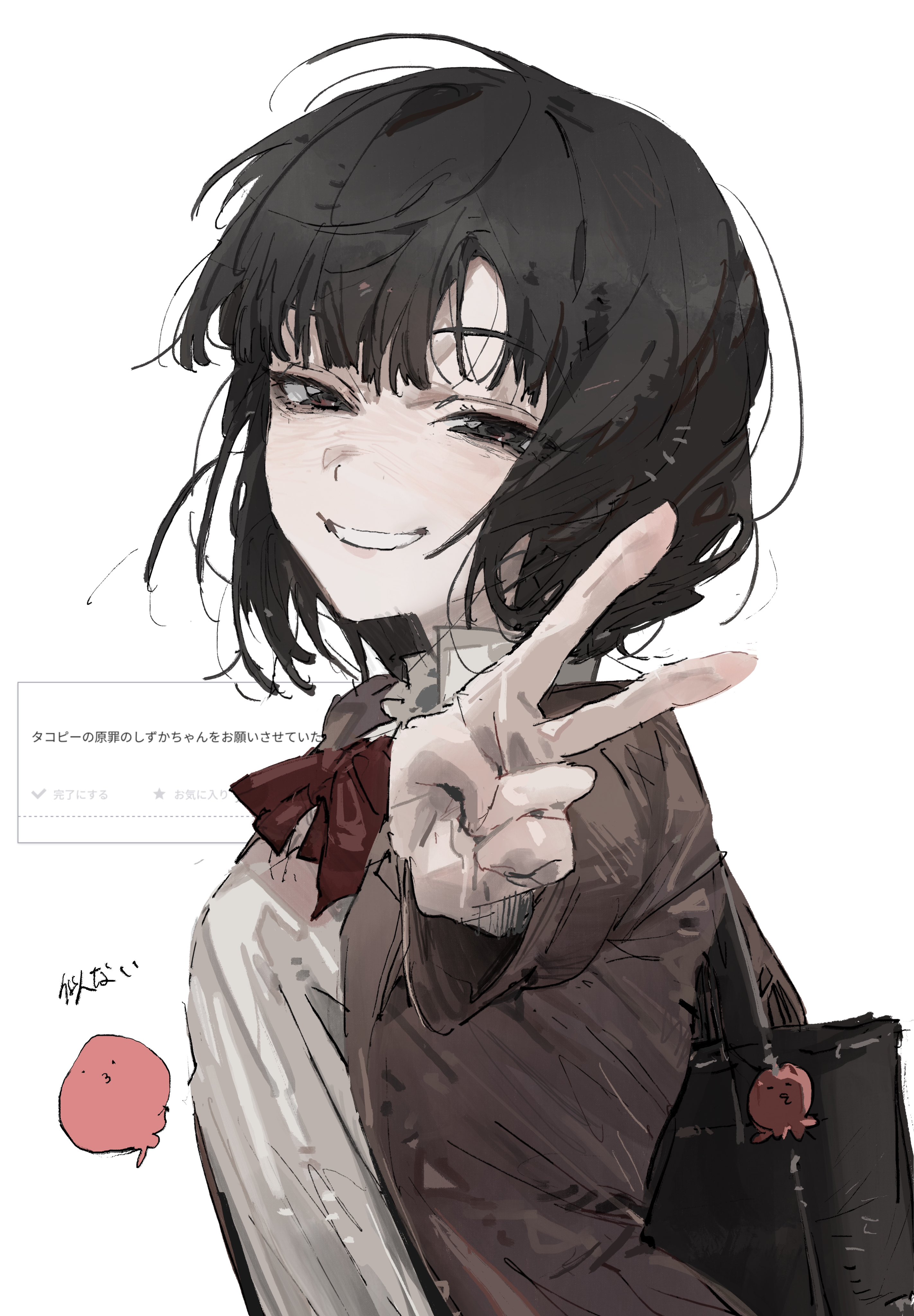 &{ID:12459325 CreatedAt:Thu Aug 14 22:31:38 -0500 2025 Score:9 Width:2844 Height:4096 MD5:ef775c998958894cb834576fe8f32da8 Directory:ef/77 Image:ef775c998958894cb834576fe8f32da8.jpg Rating:general Source:https://twitter.com/Szs0K/status/1952206414778380330 Change:1755228699 Owner:danbooru CreatorID:6498 ParentID:0 Sample:1 PreviewHeight:350 PreviewWidth:243 Tags:1girl absurdres bag bag_charm black_bag black_eyes black_hair blazer bob_cut bow bowtie brown_jacket character_charm charm_(object) collared_shirt commentary dress_shirt foreshortening from_side grin highres jacket kuze_shizuka le_(szs0k) long_sleeves looking_at_viewer odaibako open_clothes open_jacket outstretched_arm red_bow red_bowtie request_inset school_bag school_uniform shirt short_hair shoulder_bag simple_background smile solo takopii takopii_no_genzai translation_request turning_head unkempt upper_body v white_background white_shirt winter_uniform Title: HasNotes:false HasComments:false FileURL:https://img2.gelbooru.com/images/ef/77/ef775c998958894cb834576fe8f32da8.jpg PreviewURL:https://gelbooru.com/thumbnails/ef/77/thumbnail_ef775c998958894cb834576fe8f32da8.jpg SampleURL:https://img2.gelbooru.com/samples/ef/77/sample_ef775c998958894cb834576fe8f32da8.jpg SampleHeight:1224 SampleWidth:850 Status:active PostLocked:0 HasChildren:false IsVideo:false DisplayDate:14.08.2025 22:31}