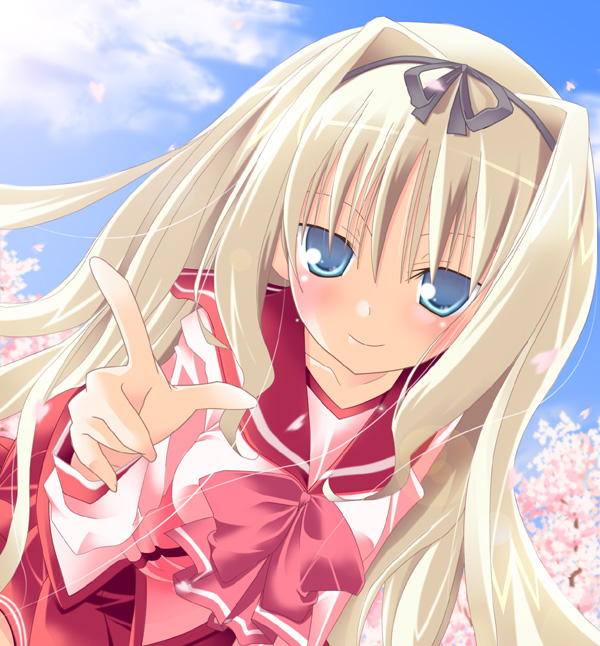 1girl 2000s_(style) bad_id blonde_hair blue_eyes blue_sky blush breasts closed_mouth cloud cowboy_shot day grey_ribbon hair_intakes hair_ribbon index_finger_raised kizuki_erika kusugawa_sasara leaning_forward long_hair long_sleeves looking_at_viewer medium_breasts outdoors red_sailor_collar red_skirt ribbon sailor_collar school_uniform shirt skirt sky smile solo to_heart_(series) to_heart_2 white_shirt