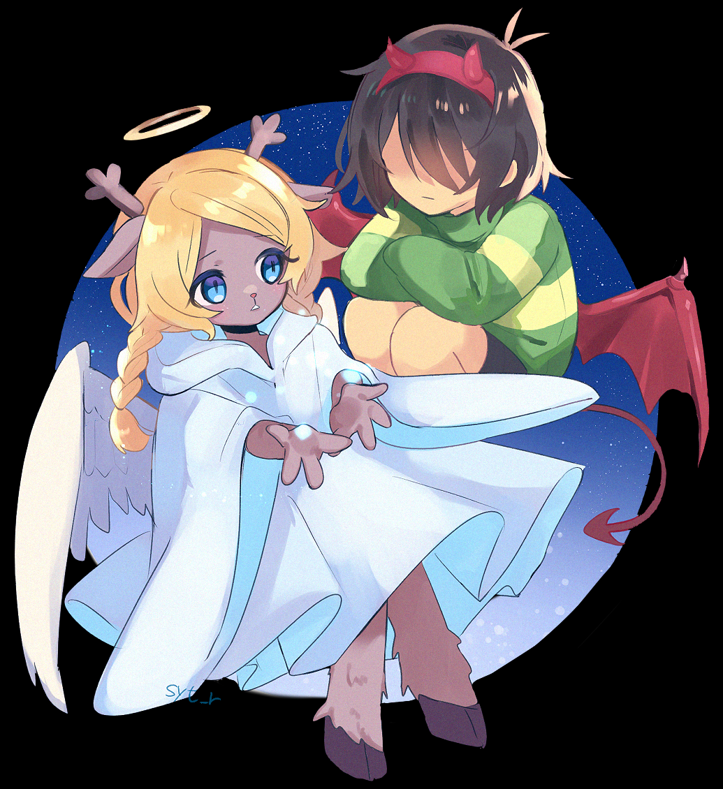 1girl 1other aged_down angel_and_devil angel_wings animal_ears antenna_hair antlers arms_on_knees black_background black_shorts blonde_hair blue_eyes braid brown_fur brown_hair buck_teeth child deer_antlers deer_ears deer_girl deer_tail deltarune demon_horns demon_tail demon_wings fake_horns freckles furry furry_female green_sweater hair_between_eyes hairband halo hooves horn_hairband horns kris_(deltarune) long_hair long_sleeves looking_at_another magic medium_hair night no_eyes noelle_holiday outstretched_hand red_nose reindeer_girl robe shaded_face shorts simple_background skirt sky smy_610 squatting sweater tail teeth twin_braids two-tone_sweater utdr_(toby_fox) white_robe white_skirt wings yellow_halo yellow_sweater