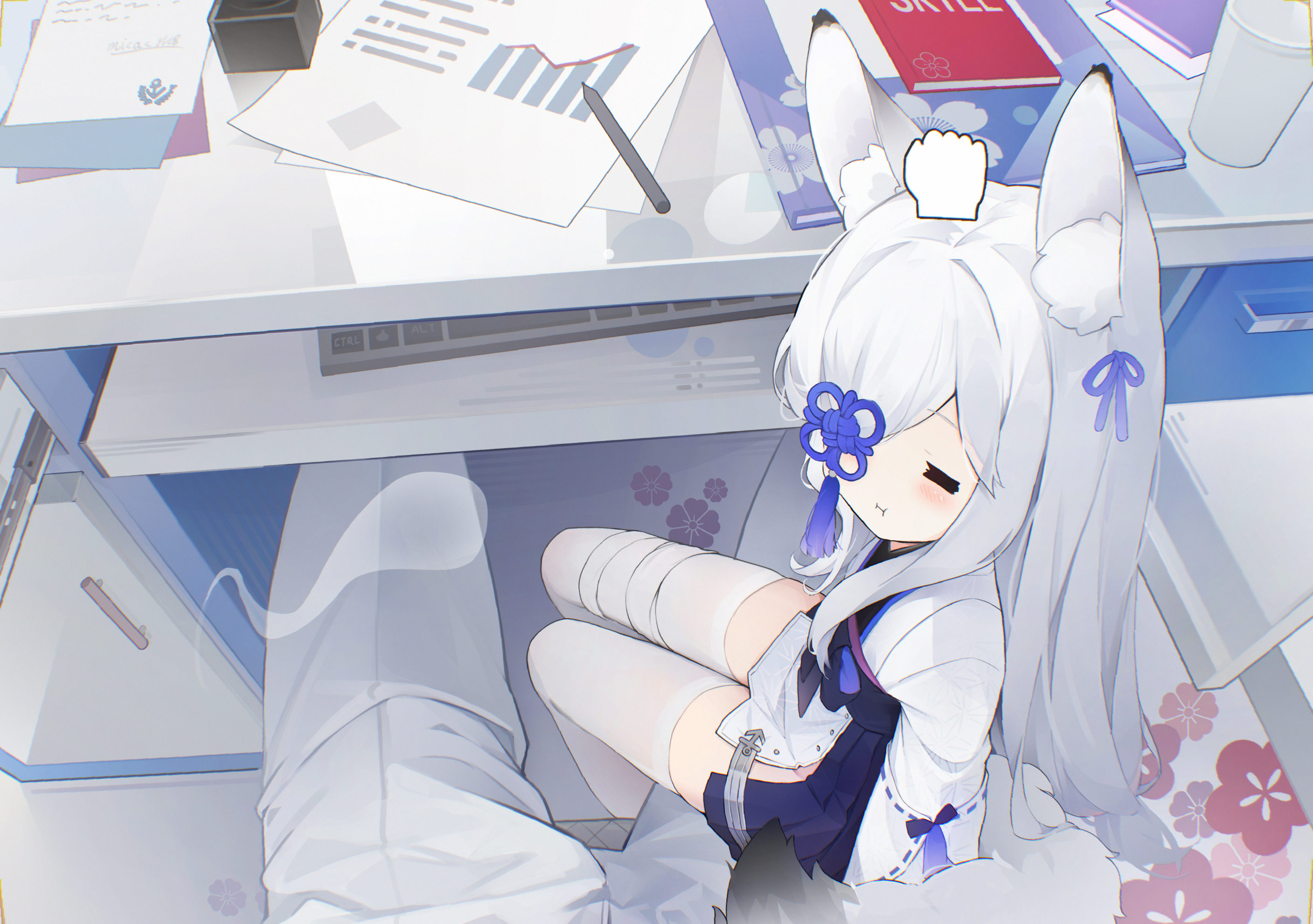 1boy 1girl animal_ear_fluff animal_ears azur_lane blush chinese_commentary closed_mouth commentary_request fox_ears fox_girl highres indoors kasumi_(azur_lane) kasumi_1118 long_hair sitting sitting_on_person thighhighs white_hair white_thighhighs