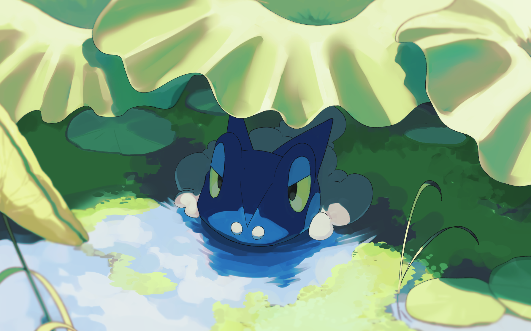 blurry commentary_request day frogadier gen_6_pokemon highres kura_(shironagasu02) nintendo no_humans outdoors pokemon pokemon_(creature) pokemon_focus reflection ripples solo water yellow_eyes