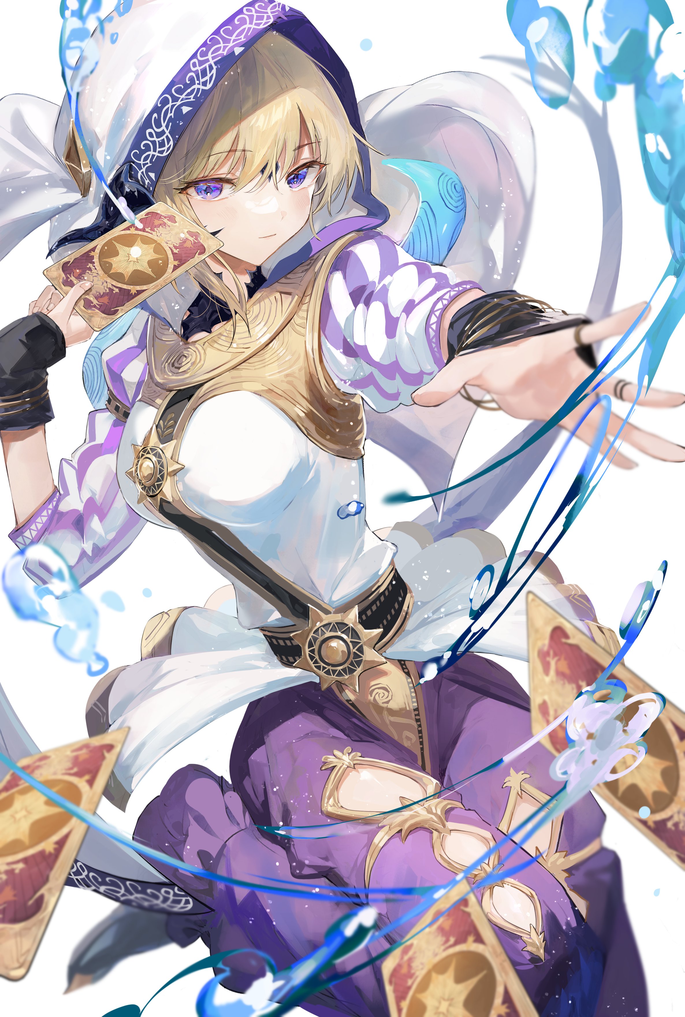 1girl absurdres au_ra black_scales blonde_hair blue_eyes card closed_mouth clothing_cutout commentary_request dragon_girl dragon_tail final_fantasy final_fantasy_xiv highres holding holding_card hood hood_up leg_up looking_at_viewer pants purple_pants reaching reaching_towards_viewer shikina_(mochigushi_) solo tail thigh_cutout warrior_of_light_(ff14) water