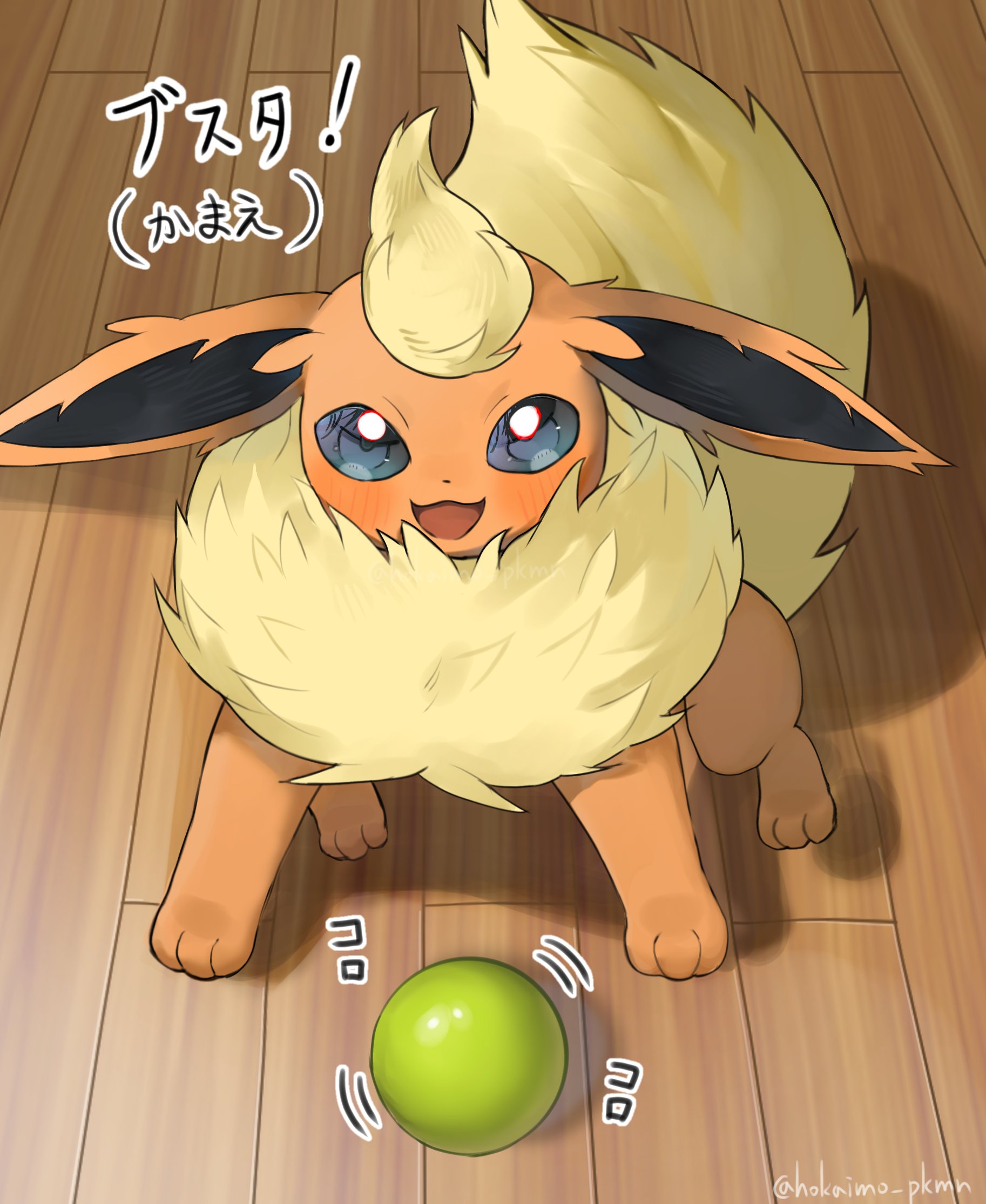 animal_focus ball blush flareon floor fluffy full_body gen_1_pokemon highres hokaimo_pkmn indoors looking_at_viewer neck_fur nintendo no_humans open_mouth orange_fur pokemon pokemon_(creature) pokemon_focus smile tail wooden_floor