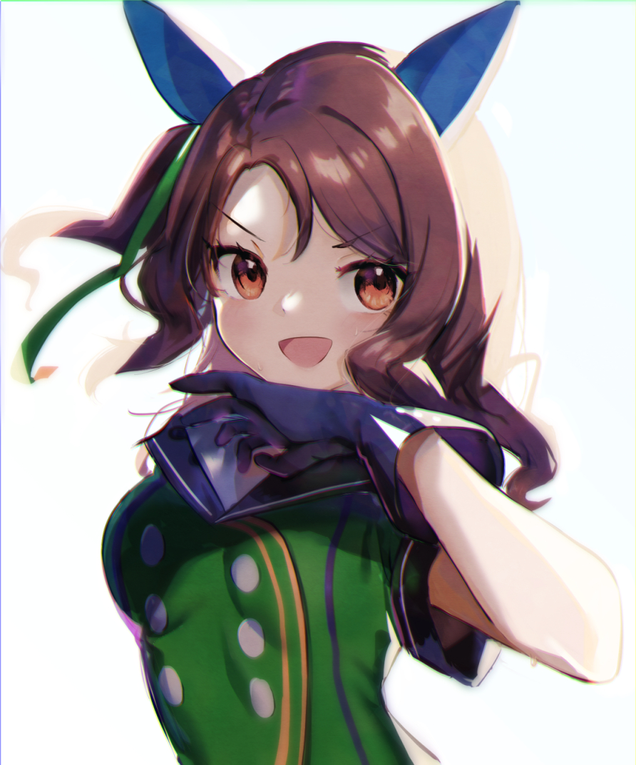 1girl brown_hair dress ear_covers green_dress haya_taro_pochi horse_girl king_halo_(umamusume) looking_at_viewer open_mouth orange_eyes smile solo umamusume upper_body white_background