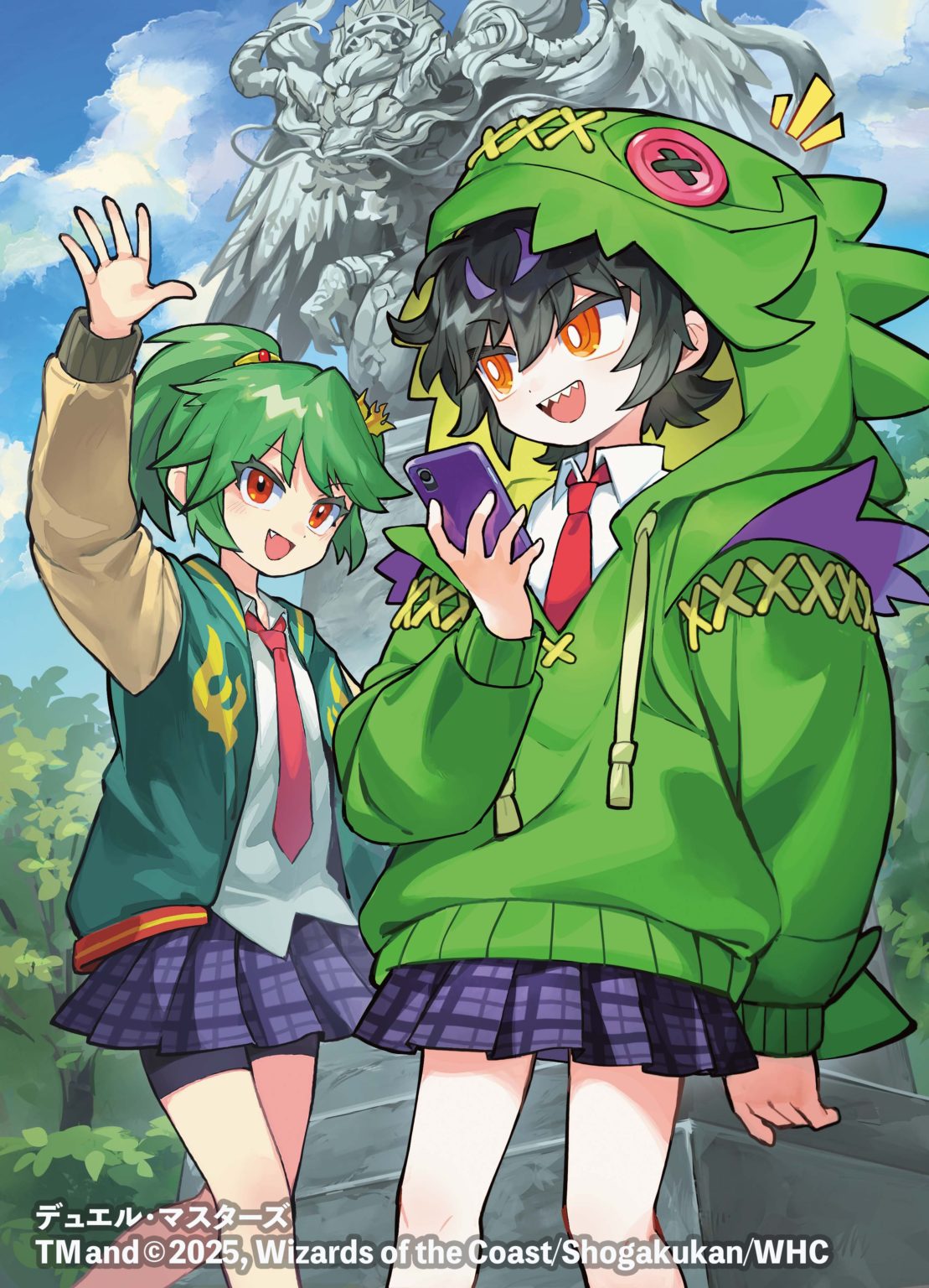 2025 2girls animal_hood arm_up black_hair black_shorts cellphone chifuin_gyai copyright_notice dragon_musume_ni_naritakunai! duel_masters fang green_hair green_hoodie green_jacket hair_ornament high_ponytail highres holding holding_phone hood hood_up hoodie hoshi_feruki jacket koroguchi long_hair multicolored_hair multiple_girls necktie notice_lines official_art open_clothes open_jacket open_mouth orange_eyes outdoors phone plaid_clothes plaid_skirt ponytail print_jacket purple_hair red_necktie sharp_teeth shirt short_hair shorts skirt smartphone statue teeth white_shirt