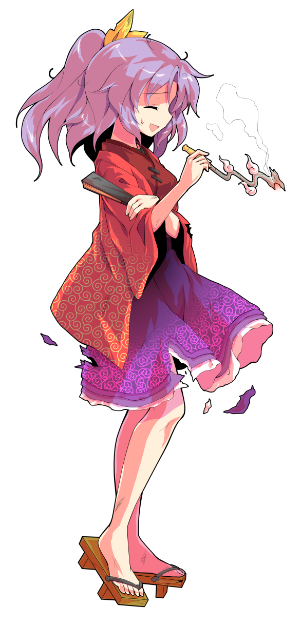 1girl alphes_(style) commentary_request dairi damaged full_body geta hand_fan highres japanese_clothes karakusa_(pattern) kimono kiseru komakusa_sannyo large_variant_set medium_skirt parody ponytail profile purple_skirt red_kimono ribbon skirt smoke smoking_pipe solo standing style_parody tachi-e torn_clothes touhou transparent_background variant_set wide_sleeves yellow_ribbon