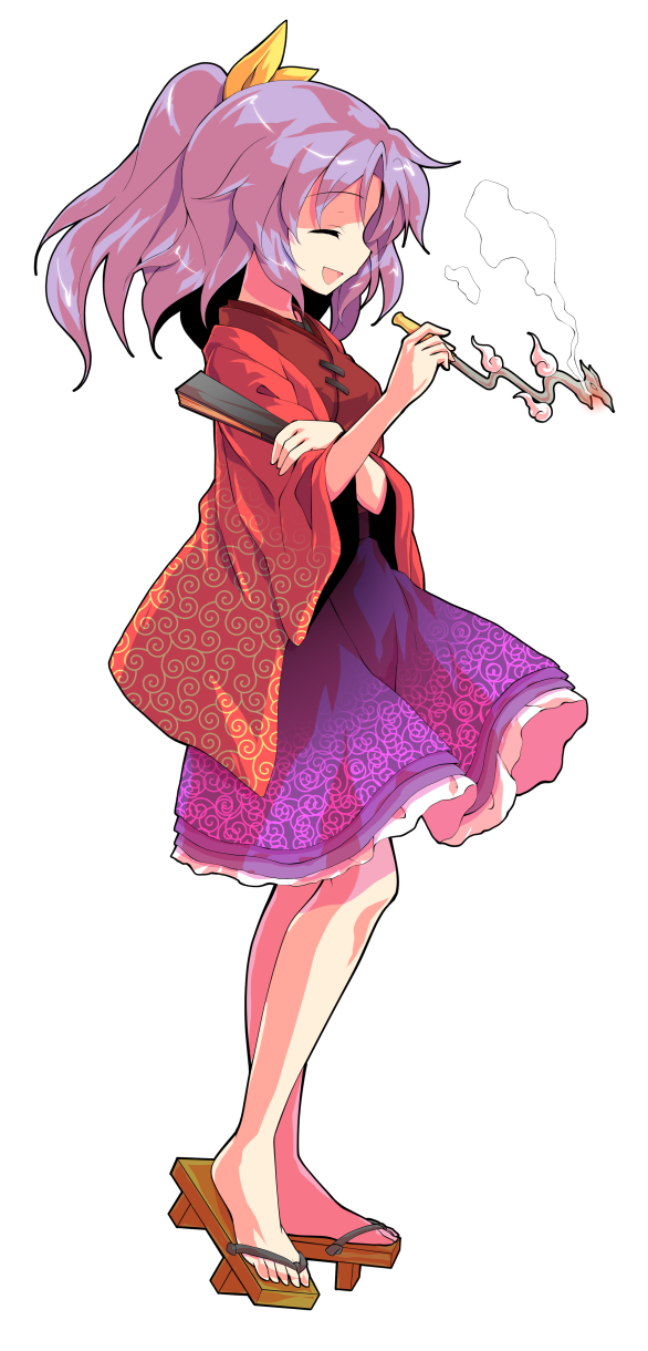 1girl alphes_(style) commentary_request dairi full_body geta hand_fan highres japanese_clothes karakusa_(pattern) kimono kiseru komakusa_sannyo large_variant_set medium_skirt parody ponytail profile purple_skirt red_kimono ribbon skirt smoke smoking_pipe solo standing style_parody tachi-e touhou transparent_background variant_set wide_sleeves yellow_ribbon