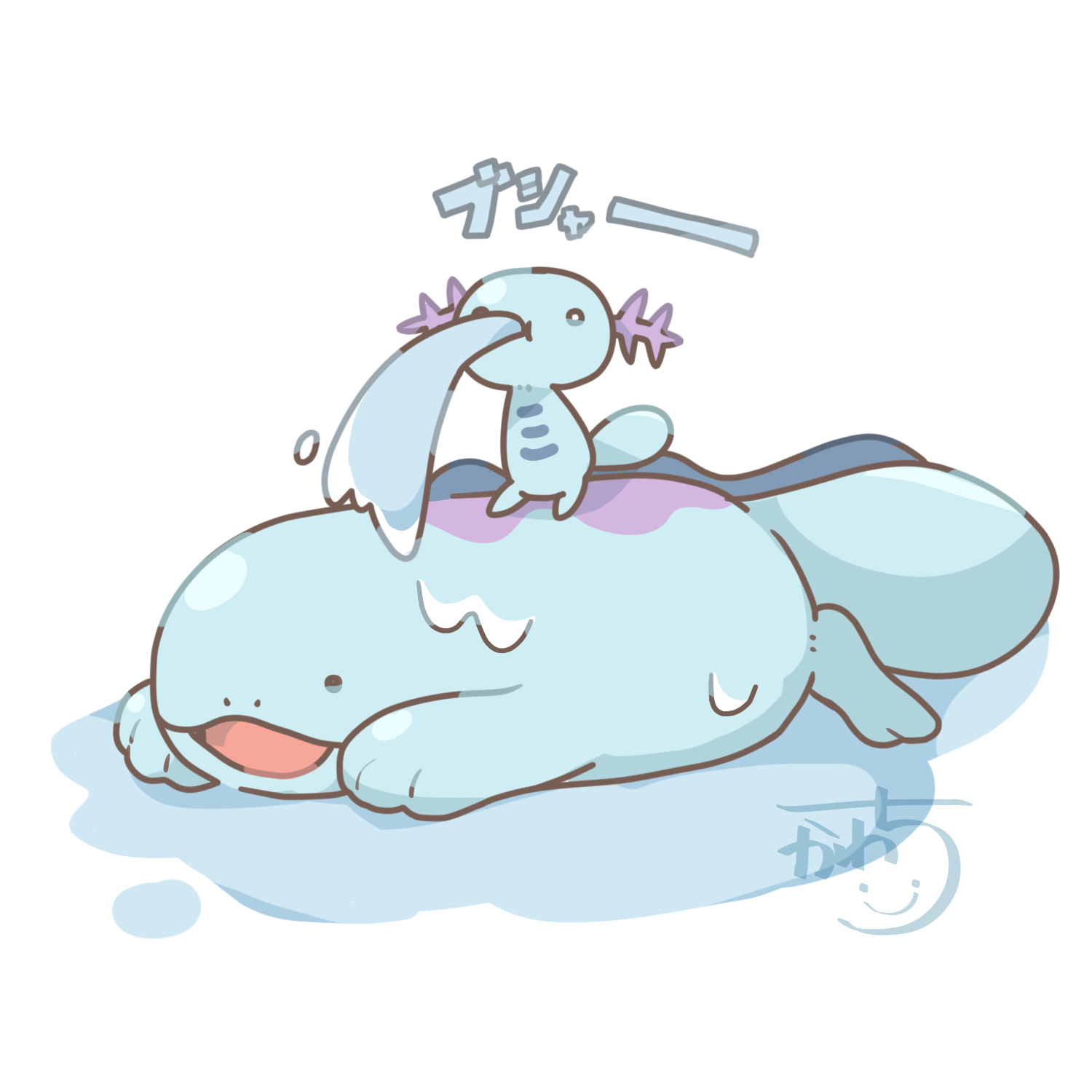 evolutionary_line gen_2_pokemon highres kawachi_(hina) lying nintendo no_humans on_stomach open_mouth pokemon pokemon_(creature) pokemon_focus puddle quagsire simple_background smile tail water water_gun_(pokemon) wet white_background wooper