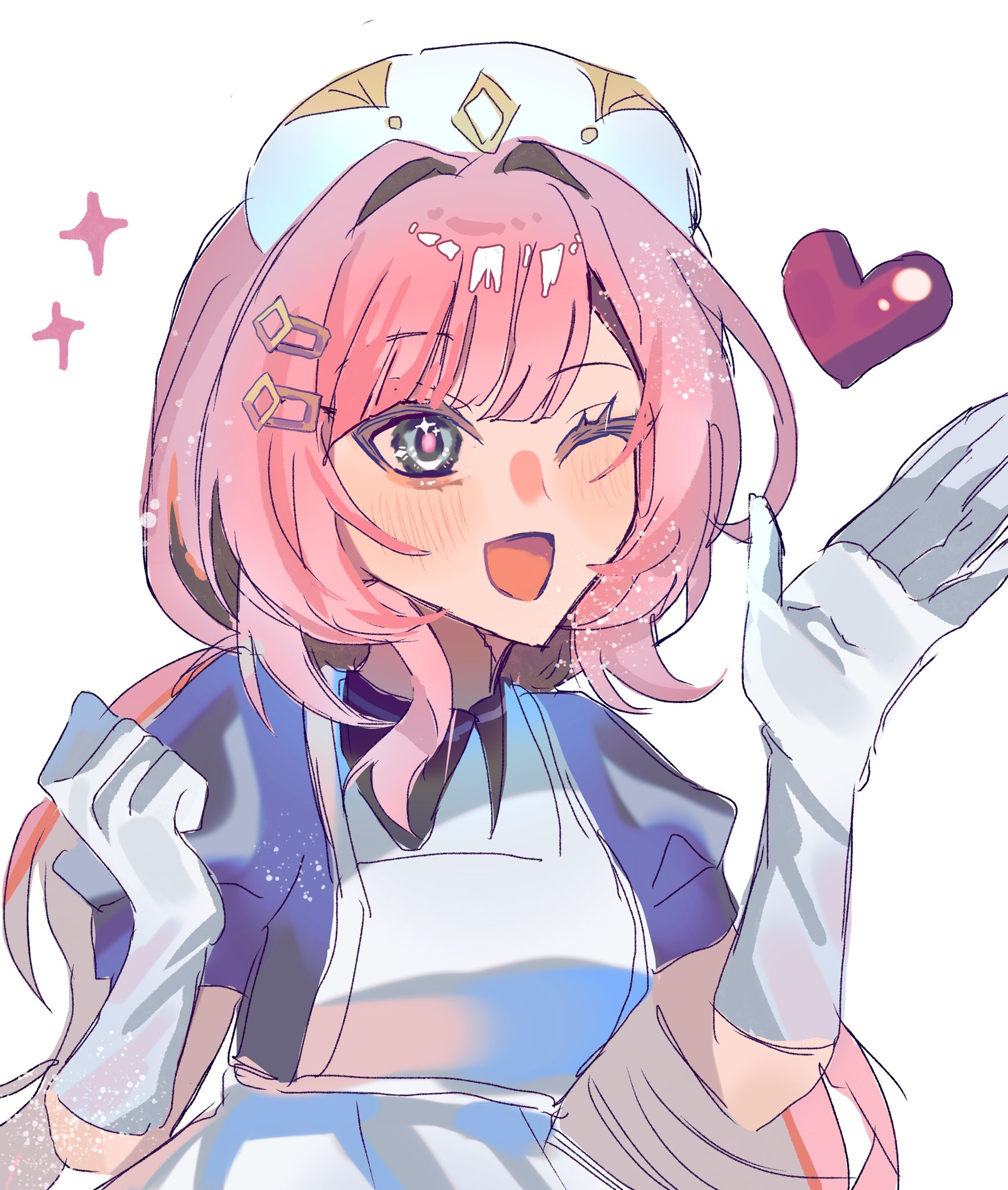 1girl ;o apron blue_dress blue_eyes breasts dress elysia_(honkai_impact) gloves hashtag-only_commentary hat heart highres honkai_(series) honkai_impact_3rd long_hair medium_breasts nurse nurse_cap one_eye_closed pink_hair poeeeee07712 simple_background solo very_long_hair white_apron white_background white_gloves