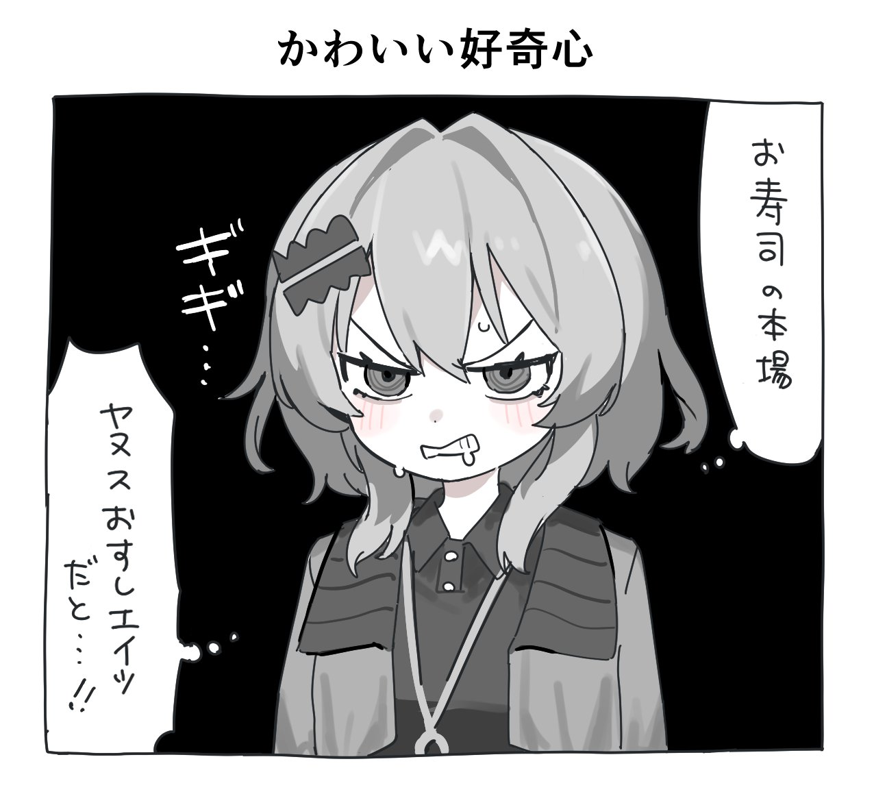 1girl angry blush collared_dress dress drooling glaring greyscale grimace hair_ornament ikonu_(lavender_quartz) jacket jewelry kunoichi_kazuhito_(kuno_kazu) lavender_quartz lavender_quartz:_kyoukai_hyoudou looking_at_viewer medium_hair monochrome mouth_drool necklace open_clothes open_jacket ringed_eyes simple_background solo spot_color sweat translation_request upper_body v-shaped_eyebrows