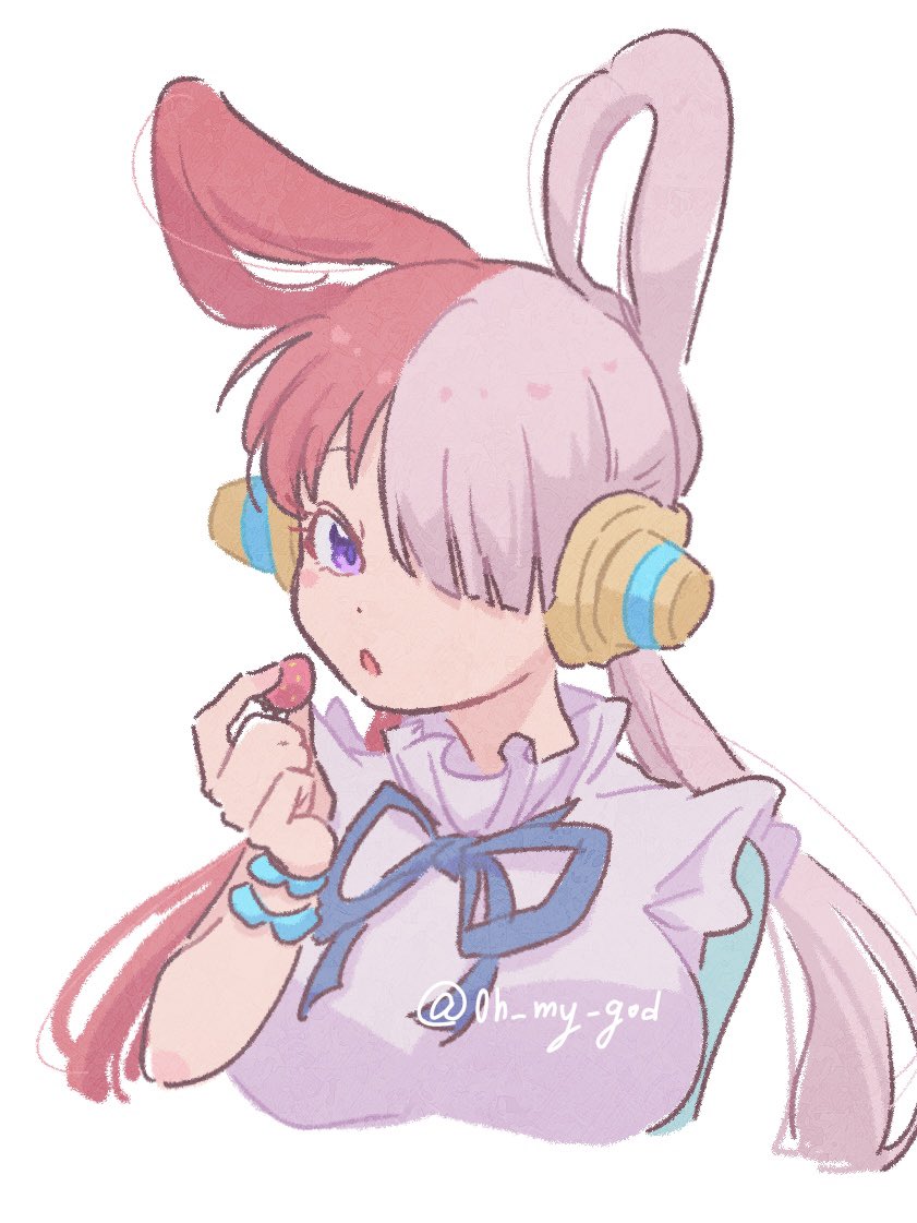 0h_my_god 1girl blue_gloves bracelet commentary_request dress elbow_gloves food fruit gloves hair_over_one_eye headphones holding holding_food holding_fruit jewelry looking_at_viewer neck_ribbon one_piece one_piece_film:_red purple_eyes red_hair ribbon simple_background single_elbow_glove sleeveless sleeveless_dress solo strawberry twintails twitter_username uta_(one_piece) white_background white_dress white_hair