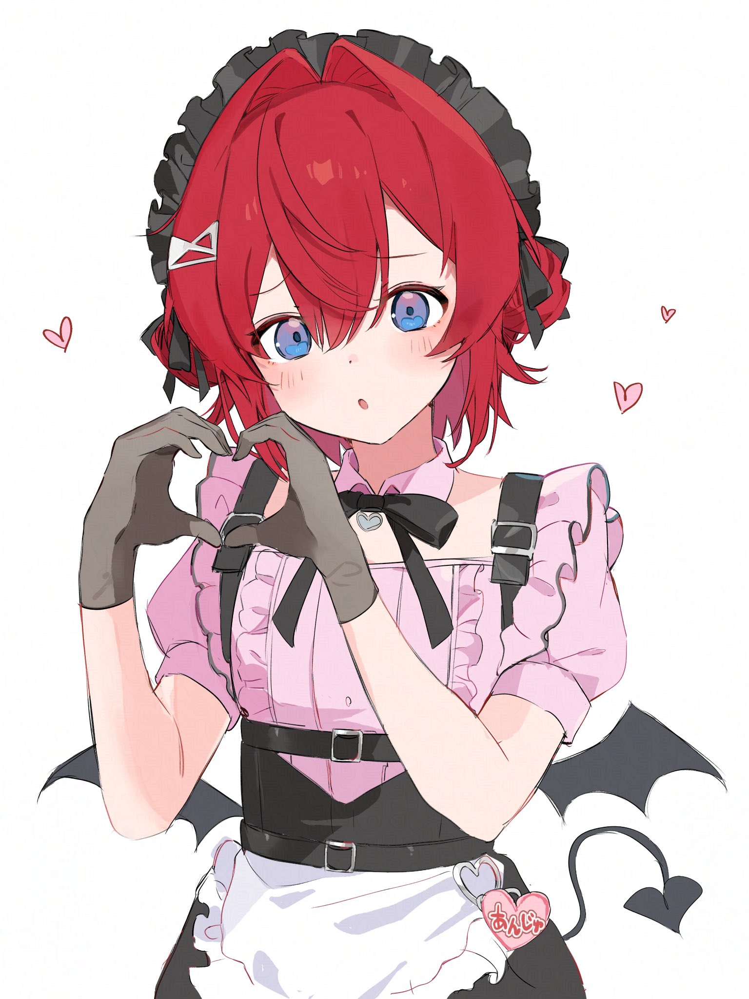 1girl :o ange_katrina apron black_headdress black_ribbon black_skirt black_tail black_wings blush chest_harness collar demon_tail demon_wings detached_collar double_bun flat_chest frilled_apron frilled_shirt frills gloves grey_gloves hair_between_eyes hair_bun hair_intakes hair_ornament hands_up happachan2do6 harness hashtag-only_commentary heart heart_hands heart_pendant high-waist_skirt highres looking_at_viewer low_wings maid_headdress mini_wings name_tag neck_ribbon nijisanji official_alternate_costume open_mouth pink_collar pink_shirt puffy_short_sleeves puffy_sleeves purple_eyes red_hair ribbon shirt shirt_tucked_in short_sleeves simple_background skirt solo tail upper_body virtual_youtuber waist_apron waitress white_apron white_background wings