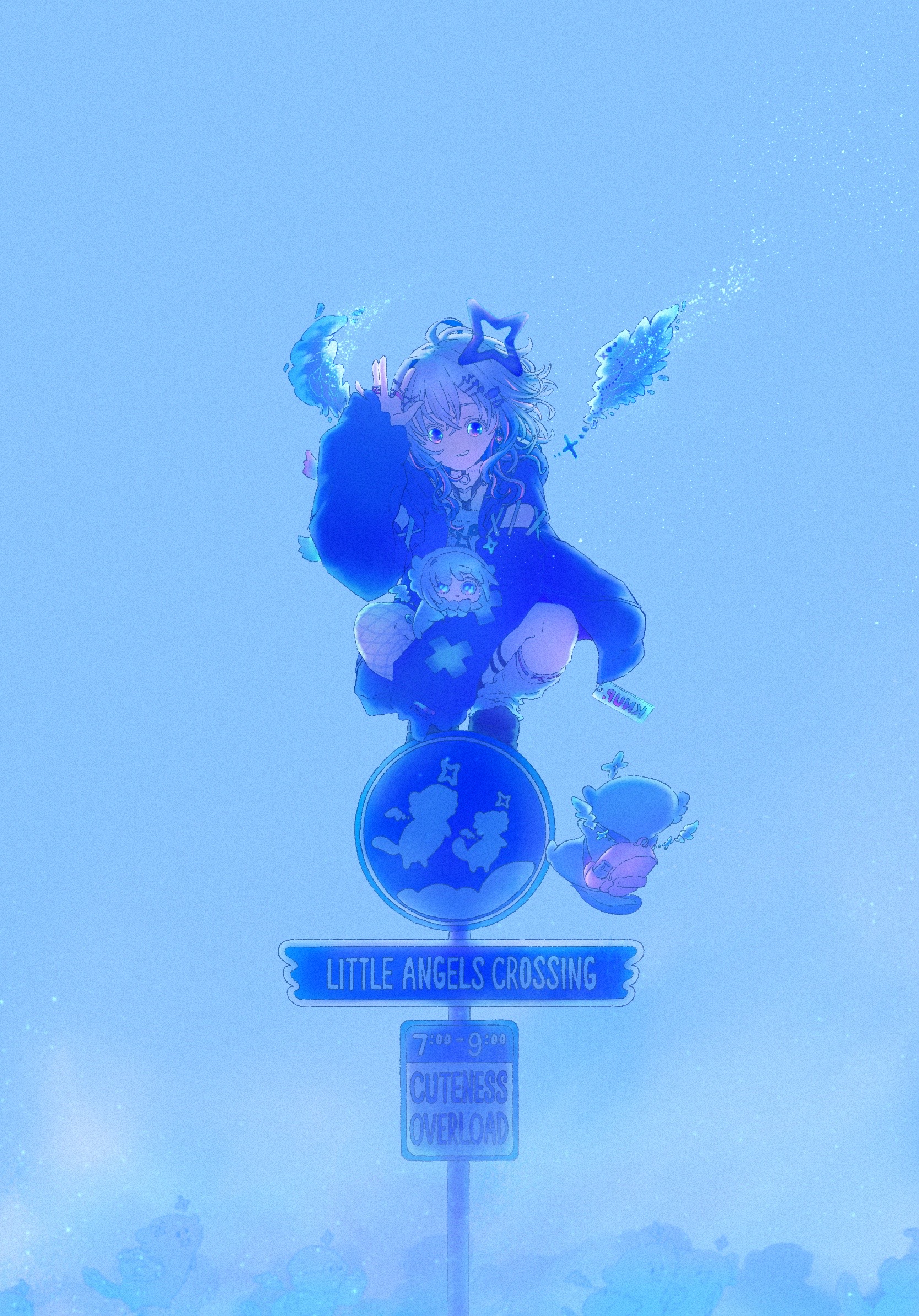 1girl 2others amane_kanata amane_kanata_(cutesy_punk) angel angel_wings asymmetrical_bangs backpack bag bear_hair_ornament bloom blue_hair blue_sky chibi colored_inner_hair feathered_wings gradient_wings grey_hair guuuuuu41 hair_ornament hairclip halo harness highres hololive jacket looking_at_viewer medium_hair mini_wings multicolored_hair multicolored_wings multiple_others o-ring o-ring_harness official_alternate_costume official_alternate_hair_length official_alternate_hairstyle pink_bag purple_eyes road_sign shirt shorts sign single_fishnet_legwear single_hair_intake single_leg_warmer sky smile squatting star_halo stop_sign streaked_hair upao_(amane_kanata) virtual_youtuber white_wings wings x_hair_ornament
