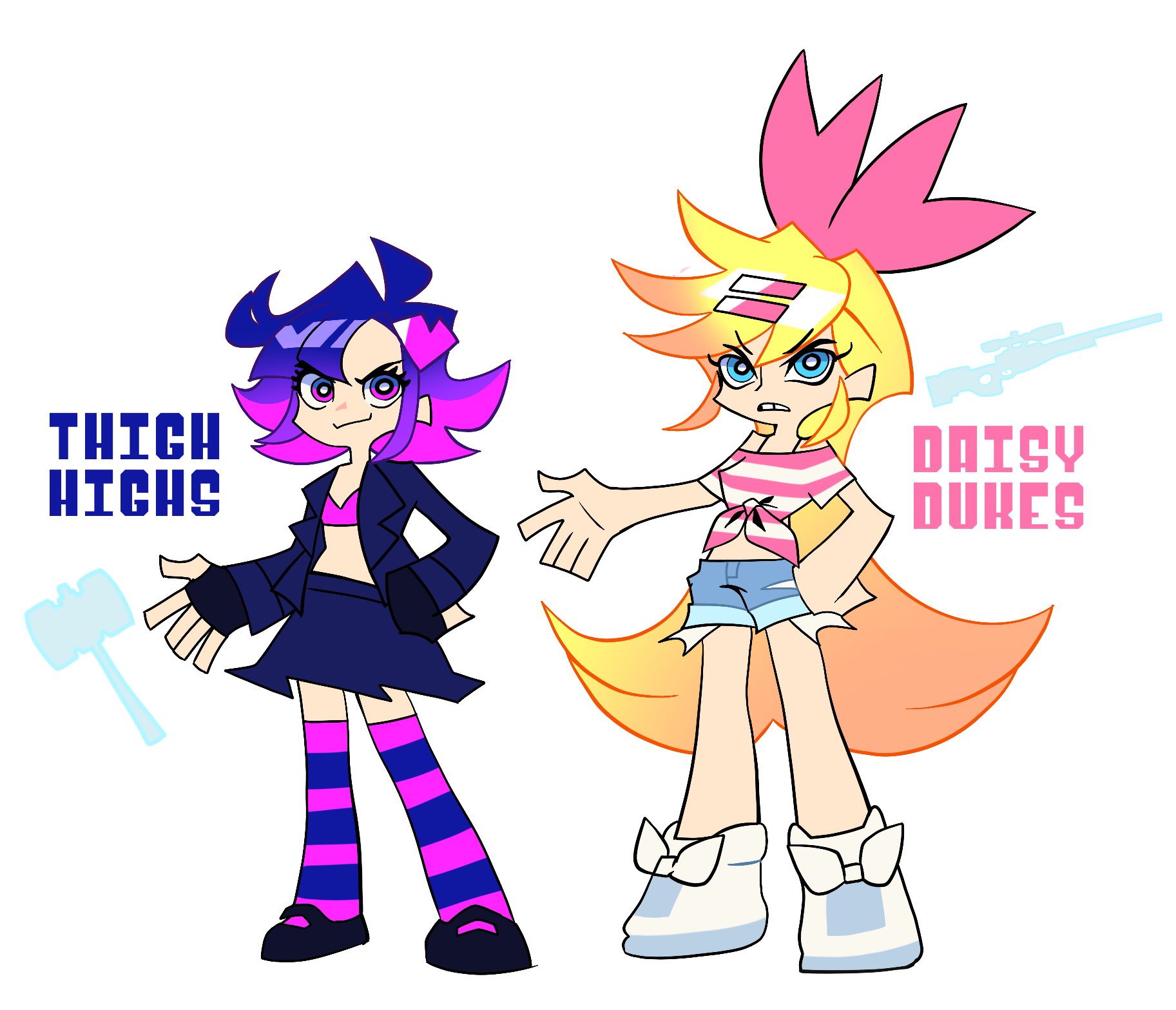 2girls deformed gloves highres long_hair marnie_(marnielovesyou) mary_rosemary maryverse multiple_girls pale_skin panty_&_stocking_with_garterbelt panty_&_stocking_with_garterbelt_(style) parody skirt skylar_mcmilliwood smile style_parody weapon