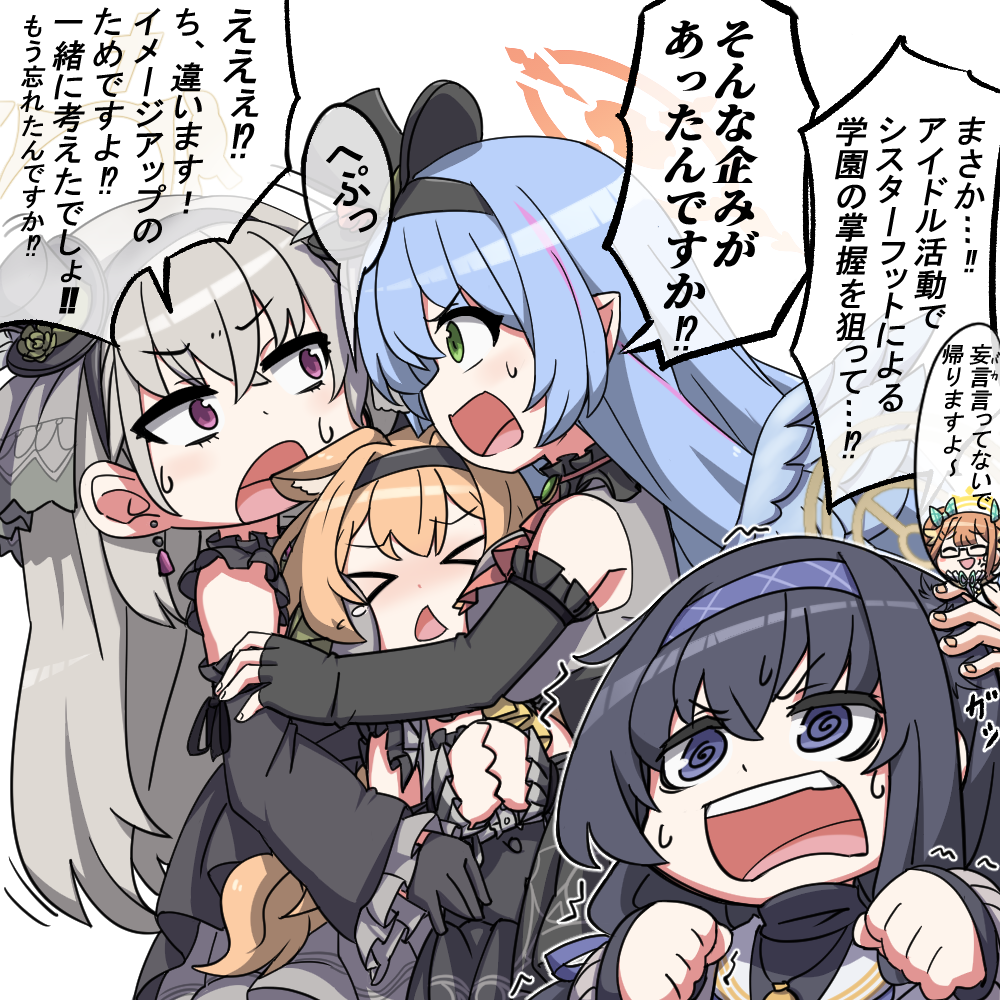 5girls animal_ears blonde_hair blue_archive blue_eyes blue_hair breasts glasses green_eyes grey_hair halo hihachi idol long_hair mari_(blue_archive) mine_(blue_archive) multiple_girls open_mouth red_eyes sakurako_(blue_archive) shimiko_(blue_archive) small_breasts standing translation_request ui_(blue_archive) underground_dweller_(blue_archive) upper_body