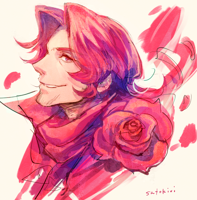 1boy artist_name bravely_default:_flying_fairy bravely_default_(series) cropped_head facial_hair fiore_derosa flower from_side goatee_stubble grin looking_at_viewer male_focus red_eyes red_flower red_hair red_rose rose satou_kivi short_hair sketch smile smirk solo stubble
