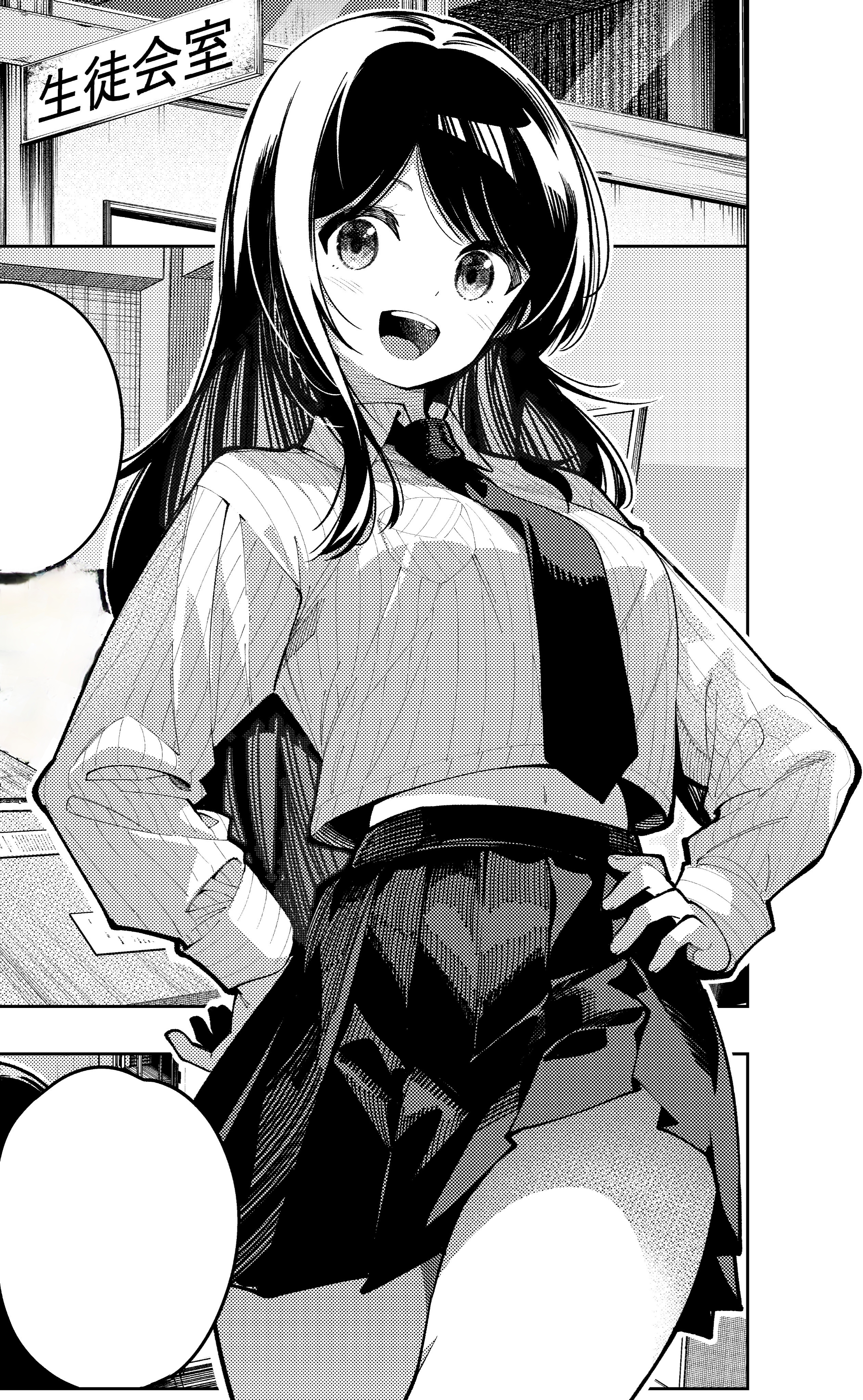 1girl absurdres armor blush breast_pocket breasts collared_shirt cropped dot_nose female_focus hands_on_own_hips highres igarashi_masakuni japanese_armor jewelry large_breasts legs long_hair long_sleeves manga_illustration manga_page mayonaka_heart_tune midriff miniskirt monochrome navel necklace official_art open_mouth parted_bangs pleated_skirt pocket shirt skirt solo solo_focus speech_bubble stomach teeth thighs third-party_edit translation_request upper_teeth_only uzuki_shinobu