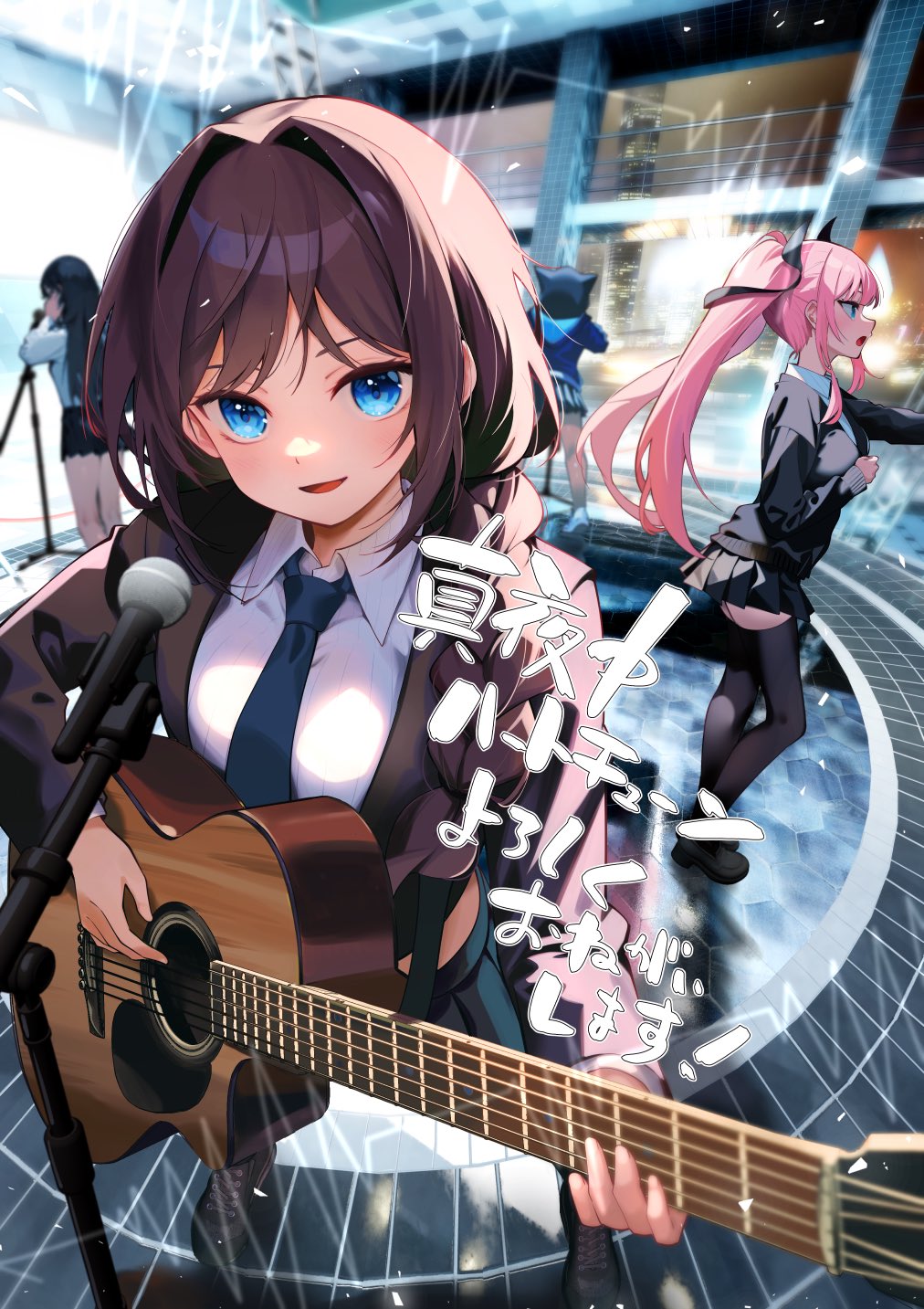 4girls acoustic_guitar animal_hood black_hair black_hoodie black_pantyhose black_shoes black_skirt black_socks black_sweater black_thighhighs blazer blue_eyes boots braid breasts brown_hair brown_jacket brown_pantyhose collared_shirt colorized cover cover_page dot_nose female_focus full_body green_eyes guitar highres himekawa_nene hood hooded_jacket hoodie igarashi_masakuni inohana_rikka instrument jacket japanese_text kirino_iko knee_boots large_breasts legs long_hair long_sleeves looking_at_viewer manga_cover manga_illustration manga_page mayonaka_heart_tune microphone microphone_stand midriff miniskirt multiple_girls necktie official_art open_mouth pantyhose pink_hair pleated_skirt school_uniform shirt shirt_under_sweater shoes skirt smirk socks sweater thighhighs thighs translation_request twintails uzuki_shinobu zettai_ryouiki
