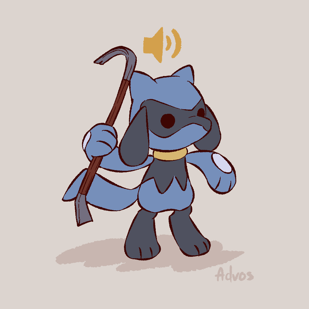 advos artist_name black_fur blue_fur chibi crowbar gen_4_pokemon grey_background holding holding_crowbar nintendo pokemon pokemon_(creature) riolu simple_background speaker speaker_sign two-tone_fur