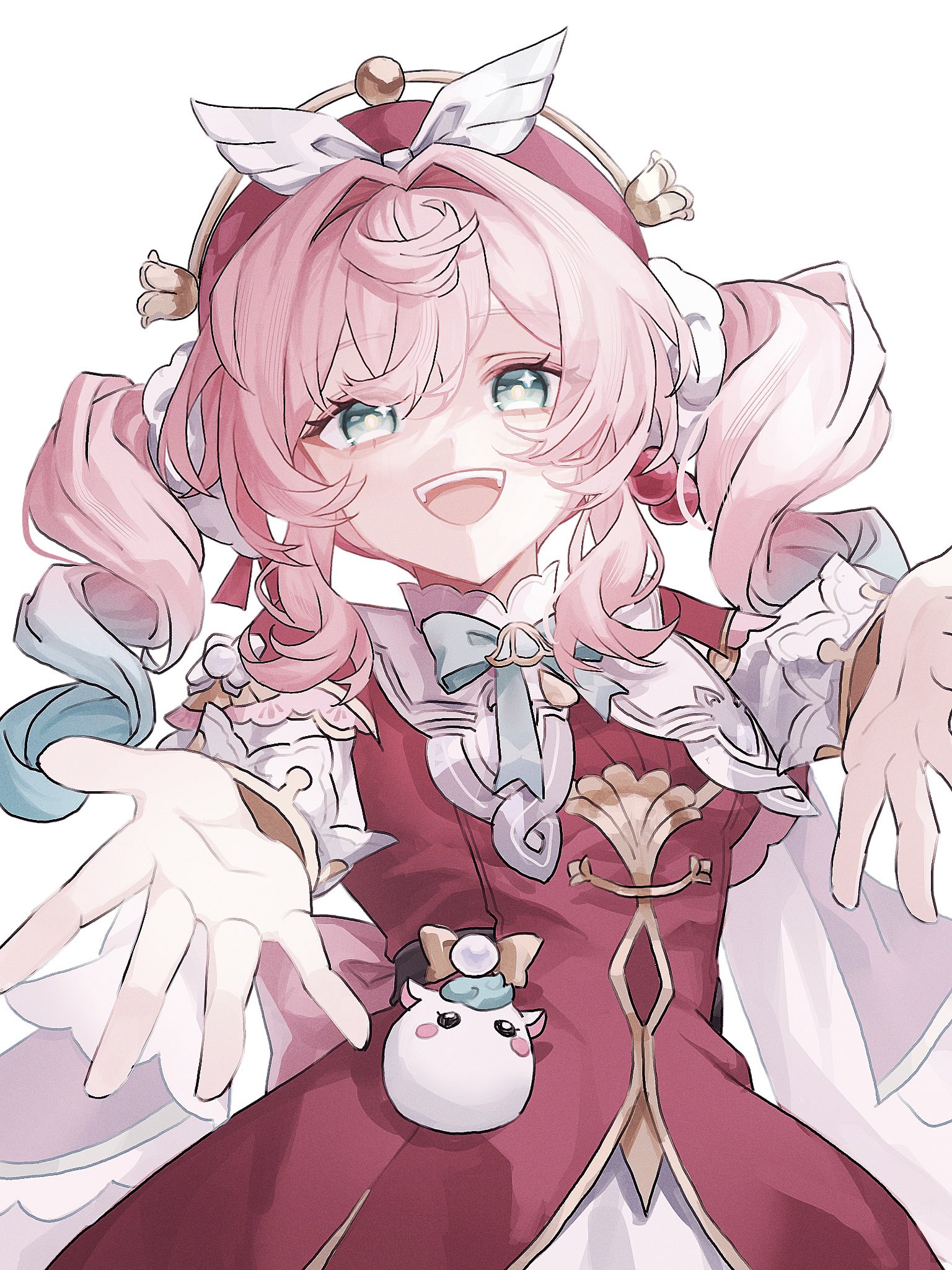 1girl aqua_eyes aqua_hair beret breasts dress fz7047 gradient_hair hair_between_eyes hat highres honkai:_star_rail honkai_(series) hyacine_(honkai:_star_rail) looking_at_viewer medium_breasts multicolored_hair open_mouth pink_hair red_dress red_hat simple_background smile solo teeth twintails two-tone_hair upper_teeth_only white_background yellow_pupils