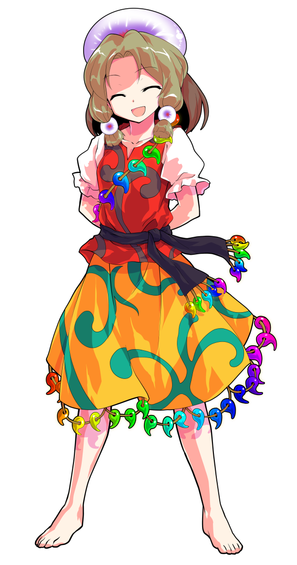 1girl alphes_(style) arms_behind_back barefoot blonde_hair commentary_request dairi earrings full_body hat jewelry large_variant_set magatama parody purple_hat red_shirt shirt short_hair short_sleeves skirt solo standing style_parody tachi-e tamatsukuri_misumaru toes touhou transparent_background unconnected_marketeers variant_set white_sleeves yellow_skirt