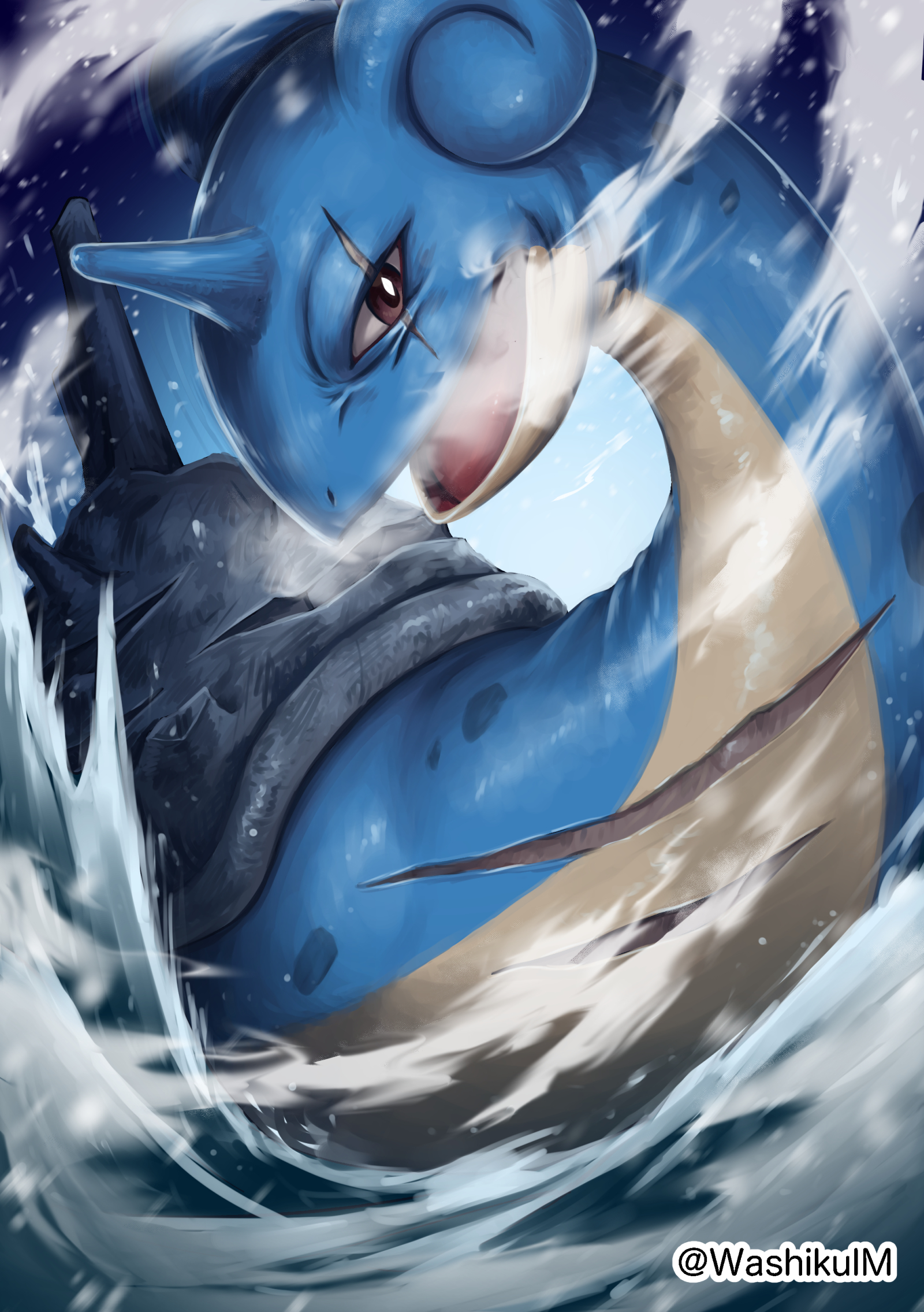 artist_name brown_eyes gen_1_pokemon highres lapras looking_at_viewer maddy nintendo no_humans open_mouth pokemon pokemon_(creature) scar scar_across_eye scar_on_face solo water
