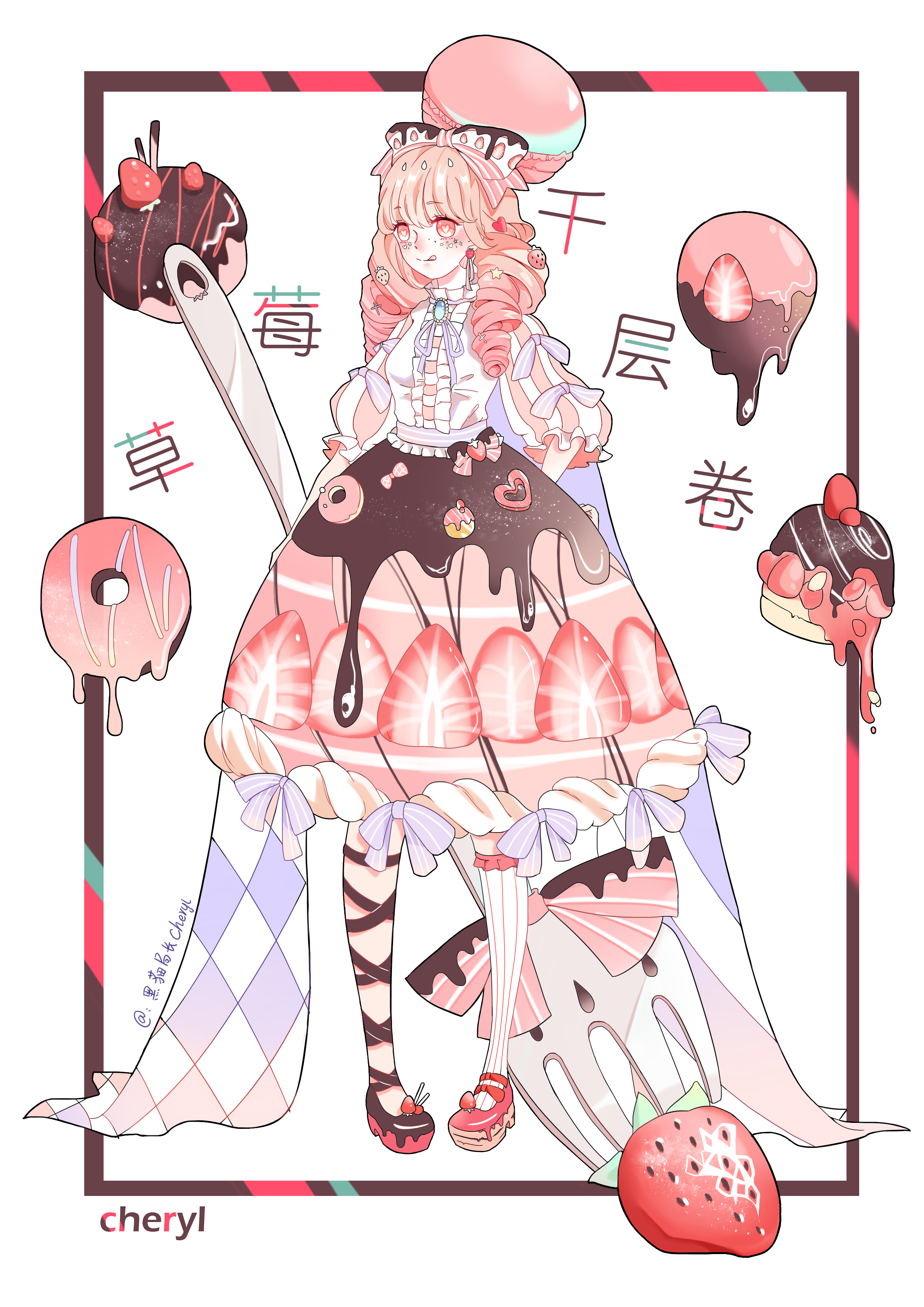 1girl :q absurdres artist_name asymmetrical_footwear border bow skirt_bow brooch brown_eyes brown_ribbon brown_shoes candy cape center_frills cheryl_qaq chinese_commentary chinese_text chocolate closed_mouth collared_shirt commentary_request donut drill_hair dripping eyelashes facial_tattoo food food-themed_clothes food-themed_hair_ornament food_print fork freckles frilled_shirt_collar frilled_sleeves frilled_socks frills fruit fruit_print full_body hair_bow hair_ornament hair_over_shoulder hand_on_own_hip happy heart heart_hair_ornament high_collar high_heels highres holding holding_fork jewelry kneehighs leg_ribbon light_blush long_hair long_sleeves looking_ahead mary_janes medium_skirt miracle_nikki mismatched_footwear multicolored_shoes neck_ribbon nikki_(series) original outside_border oversized_object pink_hair pink_shoes pink_skirt pink_sleeves puffy_long_sleeves puffy_sleeves pumps purple_bow purple_cape purple_ribbon ribbon shirt shoes signature single_kneehigh single_sock skirt smile socks solo standing star_(symbol) star_hair_ornament strawberry strawberry_hair_ornament strawberry_print strawberry_slice striped_bow striped_clothes striped_socks tareme tattoo three-quarter_sleeves tongue tongue_out translation_request twin_drills two-tone_shoes two-tone_sleeves vertical-striped_clothes vertical-striped_sleeves vertical-striped_socks white_background white_border white_bow white_shirt white_socks