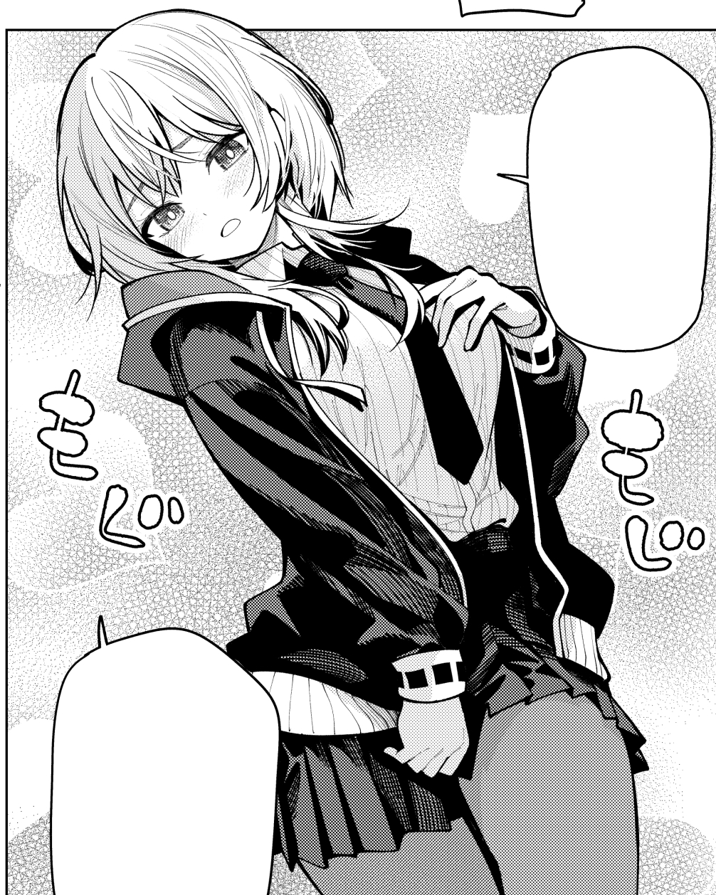 1girl blush breasts collared_shirt cropped dot_nose female_focus highres hood hooded_jacket hoodie igarashi_masakuni jacket kirino_iko large_breasts long_sleeves looking_at_viewer lying manga_illustration manga_page mayonaka_heart_tune miniskirt monochrome necktie official_art on_back open_mouth pantyhose pleated_skirt school_uniform shirt shirt_tucked_in short_hair skirt solo solo_focus speech_bubble unzipped
