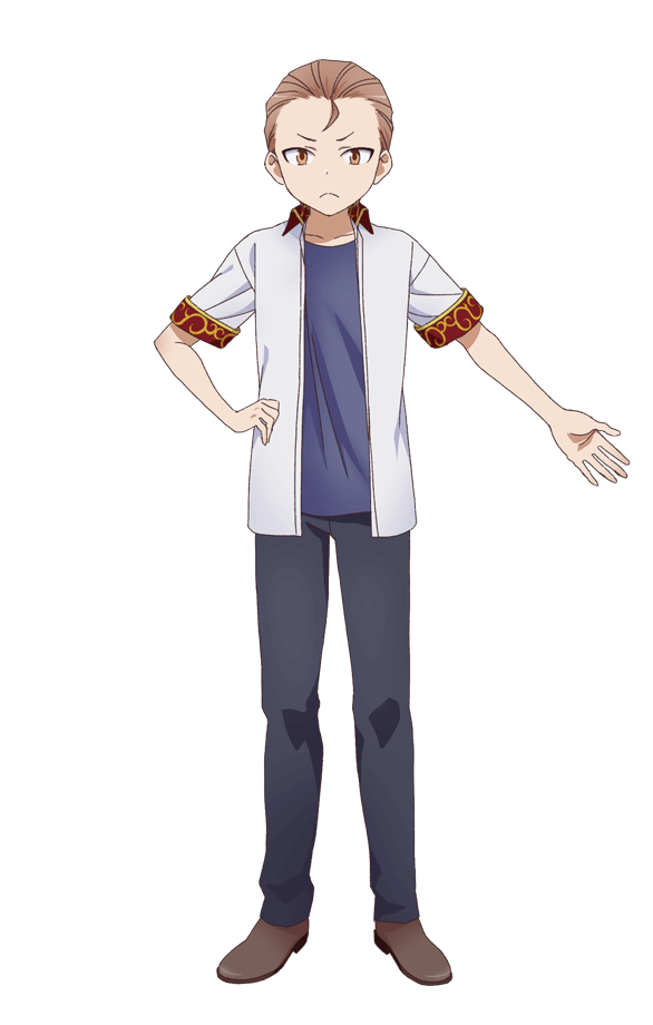 1boy anime_coloring blue_shirt brown_eyes brown_hair brown_shoes child collarbone collared_jacket dress_shoes full_body grey_pants hand_on_own_hip jacket jitsu_wa_ore_saikyou_deshita? laius_orteus looking_at_viewer official_art open_hand outstretched_arm pants shirt shoes simple_background solo spread_fingers standing t-shirt transparent_background v-shaped_eyebrows white_jacket yasuda_shouko