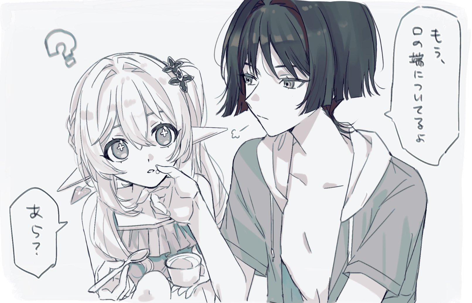1boy 1girl ? alternate_costume blunt_ends braid choppy_bangs closed_mouth collarbone contemporary cross-shaped_pupils cup curled_fingers disposable_cup disposable_ice_cream_cup drawstring food food_on_face frilled_one-piece_swimsuit frills genshin_impact hair_between_eyes hair_intakes hair_ornament half_crown_braid hand_on_another's_face hand_up height_difference highres holding holding_spoon hood hooded_jacket ice_cream jacket leaf leaf_hair_ornament long_hair looking_at_another nahida_(genshin_impact) one-piece_swimsuit onigiri_po_0205 open_clothes open_hand open_jacket pectorals pointy_ears puff_of_air scaramouche_(genshin_impact) sepia short_sleeves side_ponytail sidelocks speech_bubble spoon swimsuit symbol-shaped_pupils tareme translation_request tsurime white_background