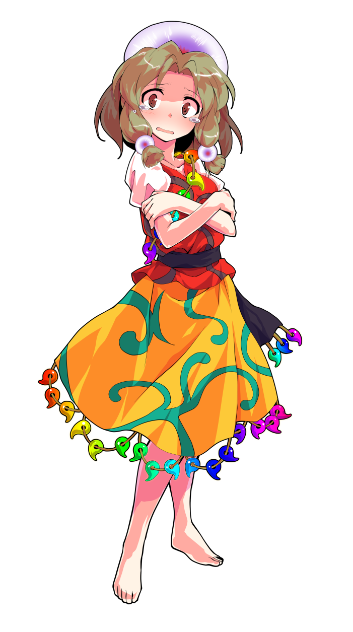 1girl alphes_(style) barefoot black_sash blunt_tresses blush brown_eyes brown_hair commentary_request crossed_arms crying crying_with_eyes_open curtained_hair dairi full_body headpiece highres large_variant_set looking_at_viewer magatama medium_skirt parody parted_lips patterned_clothing print_skirt puffy_short_sleeves puffy_sleeves rainbow_order red_vest sash shirt short_hair short_sleeves simple_background skirt solo standing style_parody tachi-e tamatsukuri_misumaru tears touhou transparent_background variant_set vest waist_sash white_shirt yellow_skirt