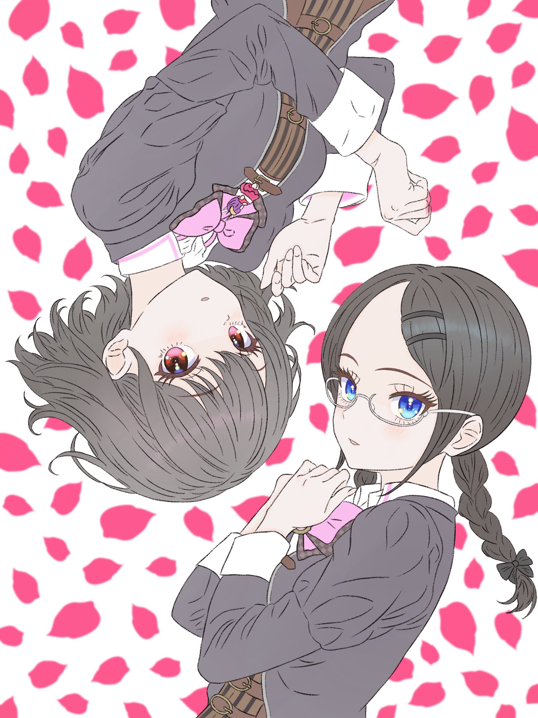 2girls assault_lily belt belt_buckle black_bow blue_eyes blush bow bowtie braid brown_belt brown_hair brown_jacket buckle collared_shirt commentary_request corset floral_background grey-framed_eyewear hair_bow hair_ornament hairclip hands_up hasegawa_gabriella_tsugumi highres jacket jewelry juliet_sleeves light_smile long_hair long_sleeves looking_at_viewer low_twin_braids low_twintails ludvico_private_girls'_academy_school_uniform lying matsunaga_brigitta_kayo multiple_girls on_side own_hands_together parted_bangs parted_lips pendant petals pickles_(picpicpickles) pink_bow pink_bowtie puffy_sleeves red_eyes school_uniform semi-rimless_eyewear shirt short_hair twin_braids twintails under-rim_eyewear underbust upper_body upside-down white_background white_shirt