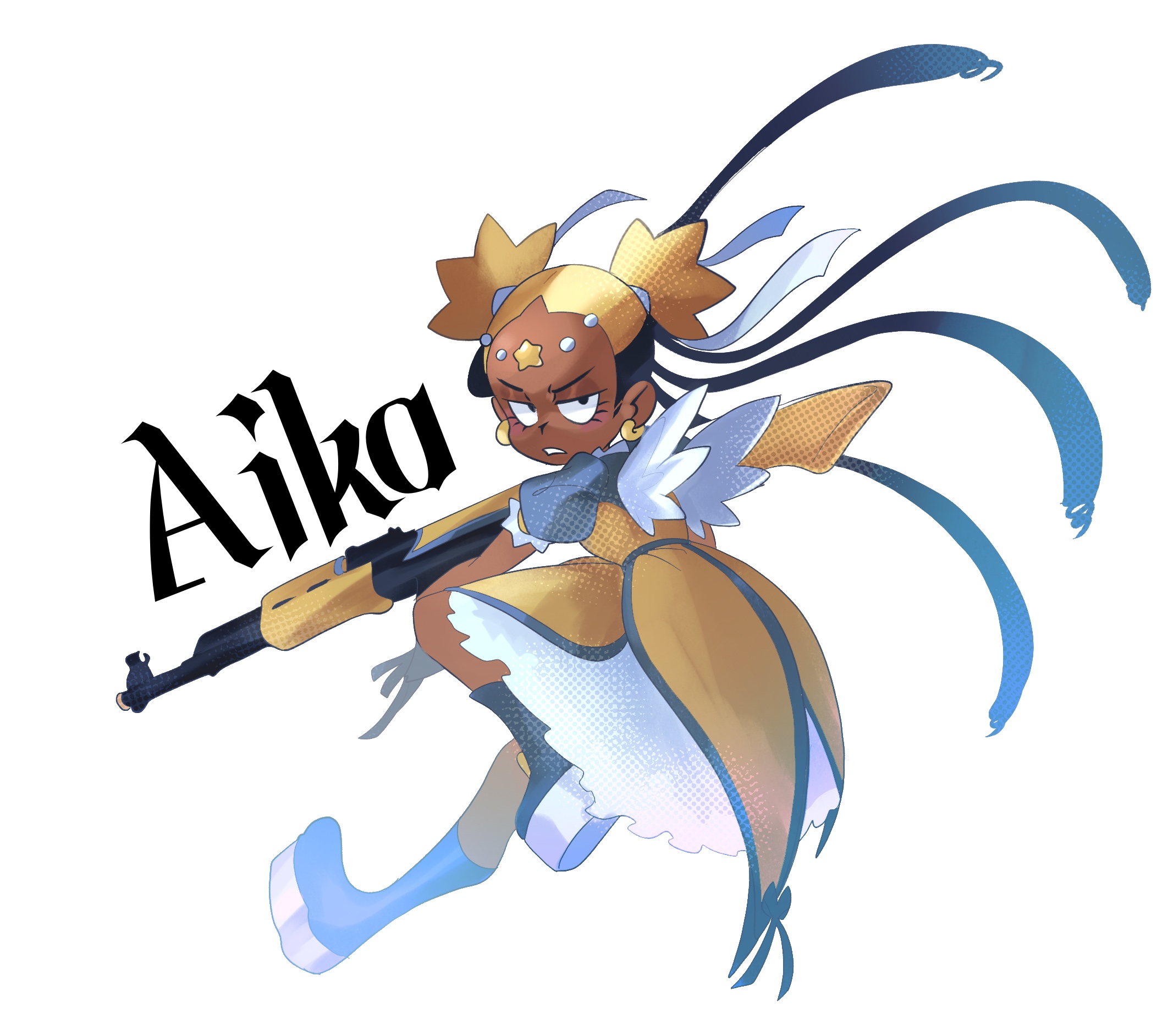 1girl aika_(kiana_mai) black_hair blonde_hair dark-skinned_female dark_skin dreadlocks dress gun highres holding i_don't_want_to_be_a_magical_girl long_hair magical_girl marnie_(marnielovesyou) multicolored_hair solo star_guardian:_guardian_of_the_stars two-tone_hair very_dark_skin weapon wings