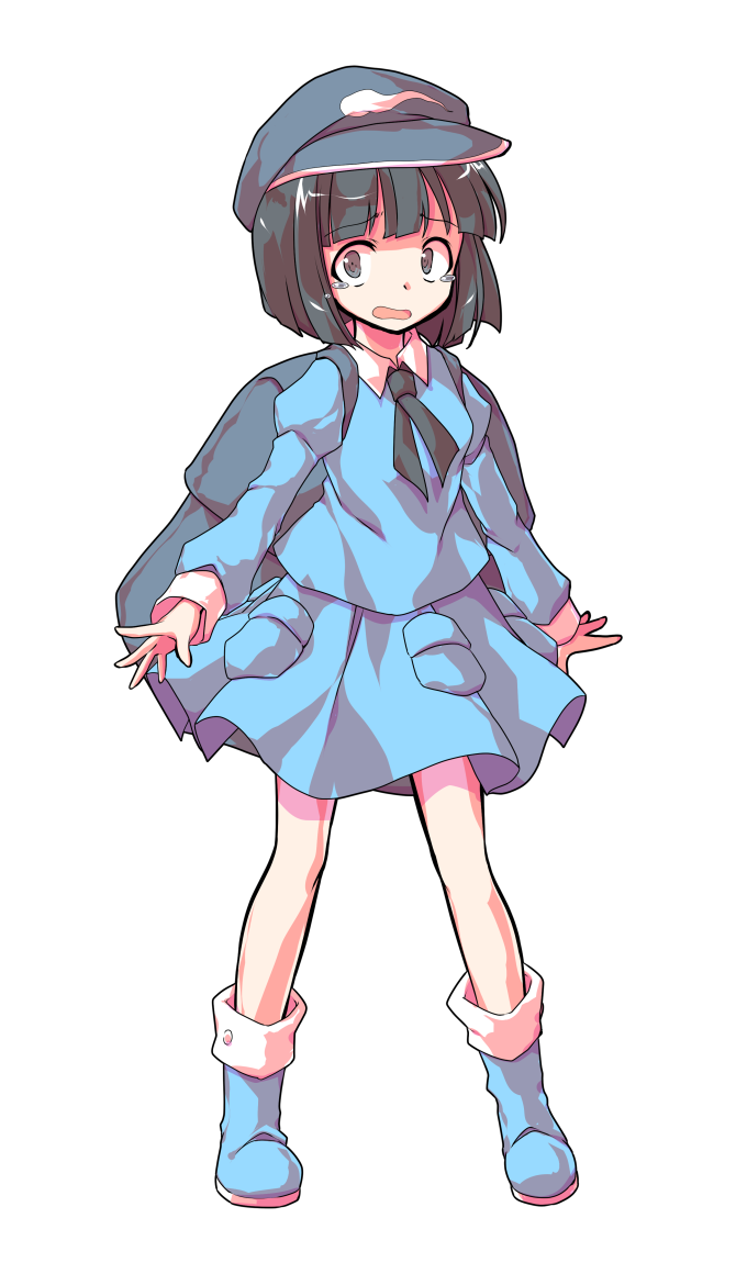1girl alphes_(style) backpack bag black_eyes blue_boots blue_hat blue_shirt blue_skirt blunt_bangs boots collared_shirt commentary_request crying crying_with_eyes_open dairi dark_haired_kappa full_body hat kappa_mob_(touhou) large_variant_set legs_apart long_sleeves miniskirt open_mouth parody pouch puffy_long_sleeves puffy_sleeves shirt short_hair skirt skirt_set solo standing style_parody tachi-e tears touhou transparent_background variant_set