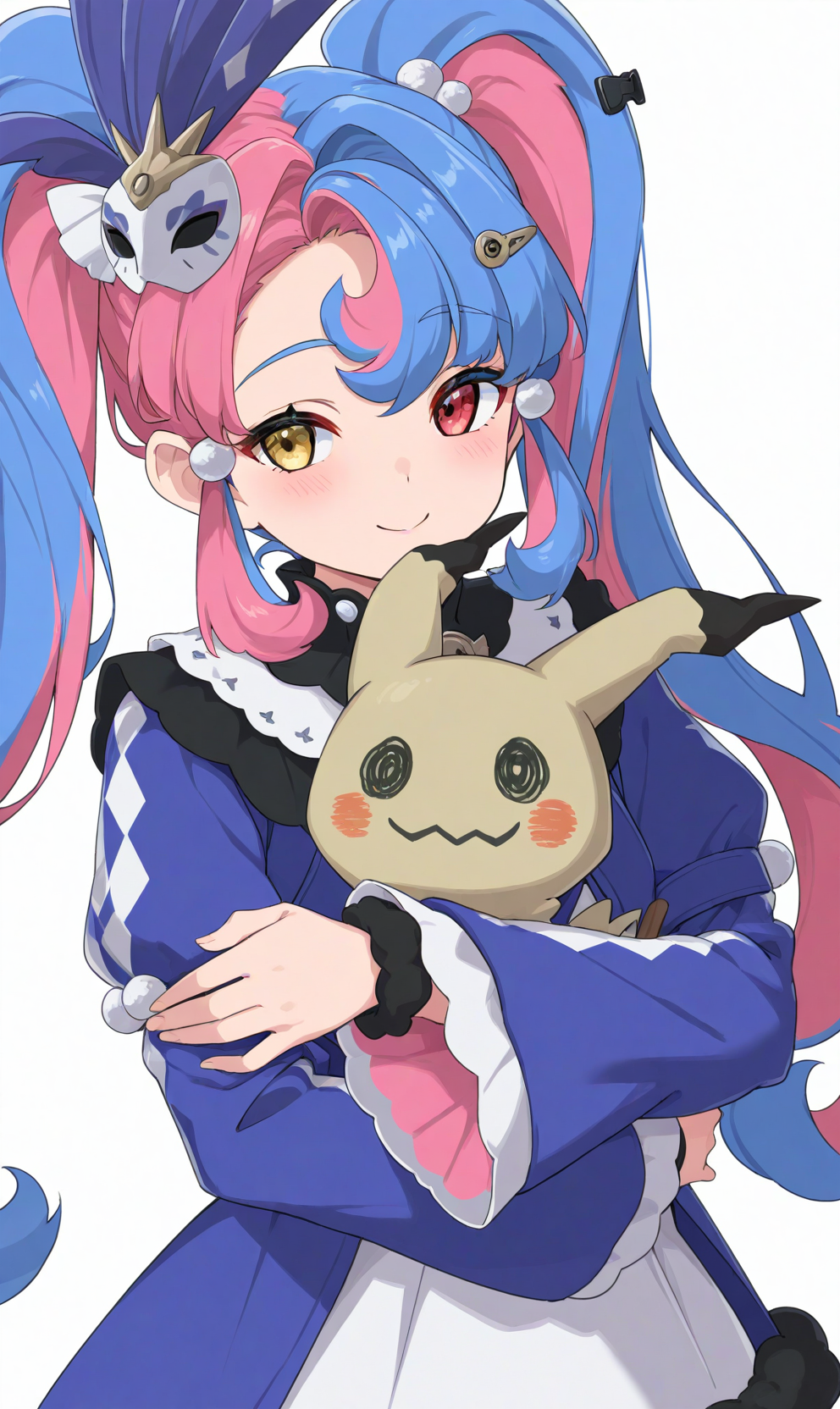 1girl artist_request blue_dress blue_hair blush bracelet closed_mouth doll dress female_focus hair_ornament heterochromia highres jewelry mask multicolored_hair pink_hair red_eyes roccia_(wuthering_waves) simple_background smile solo tagme white_background wuthering_waves yellow_eyes