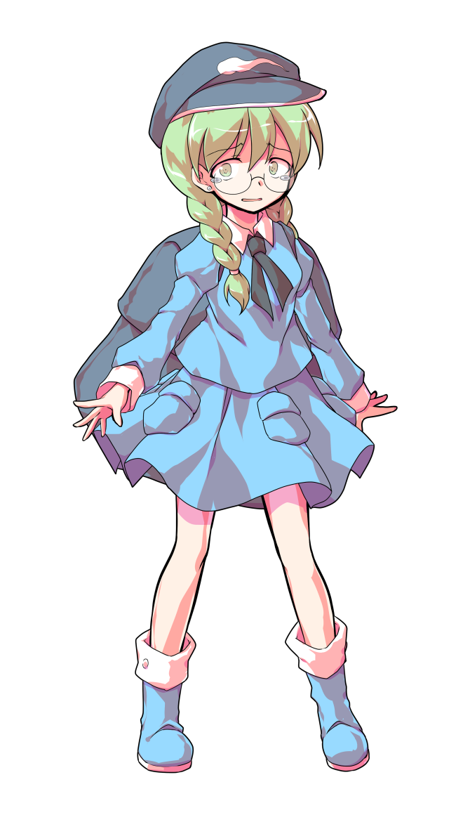 1girl alphes_(style) backpack bag blue_boots blue_hat blue_shirt blue_skirt boots braid collared_shirt commentary_request dairi full_body glasses glasses_kappa green_eyes green_hair hair_between_eyes hair_over_shoulder hair_tie hat kappa_mob_(touhou) large_variant_set legs_apart long_hair long_sleeves miniskirt parody round_eyewear rounded_corners semi-rimless_eyewear shirt skirt solo standing style_parody tachi-e touhou transparent_background twin_braids under-rim_eyewear variant_set