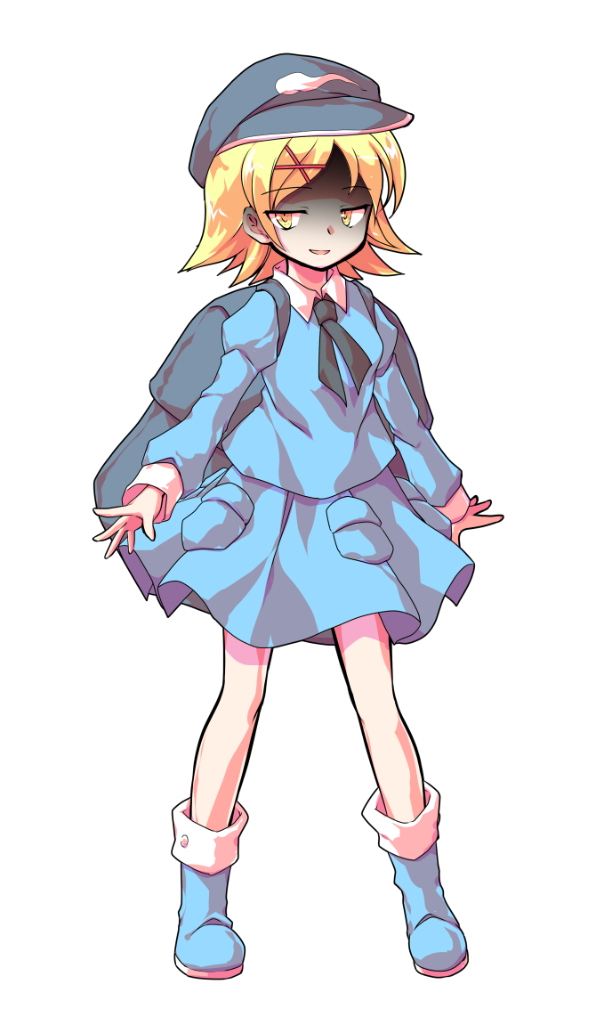 1girl alphes_(style) blonde_hair blue_boots blue_hat blue_shirt blue_skirt boots collared_shirt commentary_request dairi full_body hair_ornament hair_tie_kappa hat kappa_mob_(touhou) large_variant_set legs_apart long_sleeves miniskirt parody parted_bangs pouch puffy_long_sleeves puffy_sleeves shaded_face shirt short_hair skirt skirt_set solo standing style_parody tachi-e touhou transparent_background variant_set x_hair_ornament