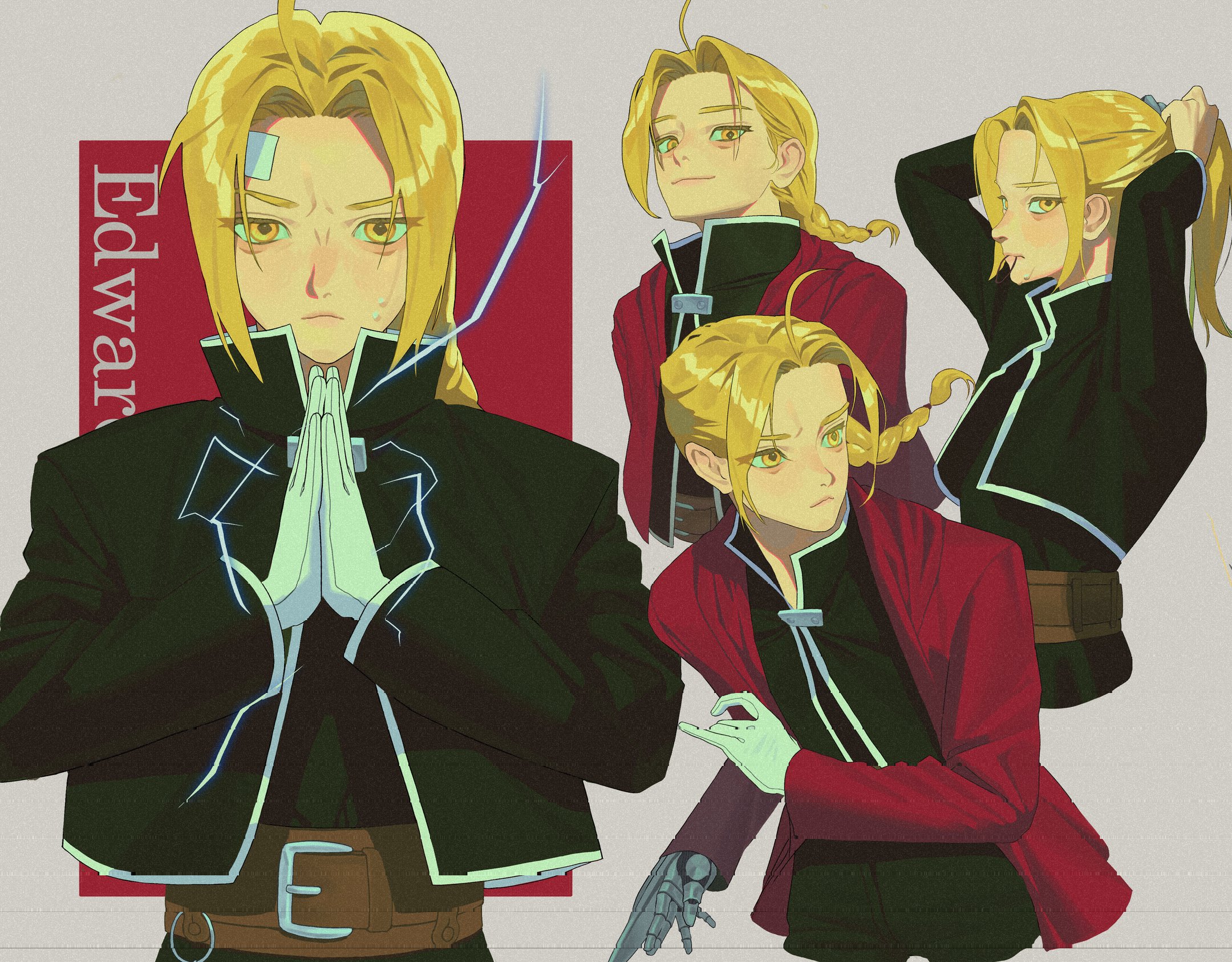 1boy ahoge bandaid bandaid_on_face bandaid_on_forehead black_jacket black_shirt blonde_hair braid character_name coat cropped_legs edward_elric fullmetal_alchemist furrowed_brow gloves hair_tie_in_mouth hands_in_own_hair highres jacket light_smile male_focus mechanical_arms military_uniform mouth_hold multiple_views own_hands_together parted_bangs ponytail red_coat riico_90 shirt single_braid single_mechanical_arm solo upper_body white_gloves yellow_eyes