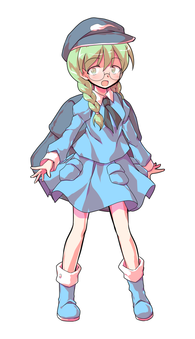 1girl alphes_(style) backpack bag blue_boots blue_hat blue_shirt blue_skirt blush boots braid collared_shirt commentary_request dairi full_body glasses glasses_kappa green_eyes green_hair hair_between_eyes hair_over_shoulder hair_tie hat kappa_mob_(touhou) large_variant_set legs_apart long_hair long_sleeves miniskirt parody round_eyewear rounded_corners semi-rimless_eyewear shirt skirt solo standing style_parody tachi-e touhou transparent_background twin_braids under-rim_eyewear variant_set