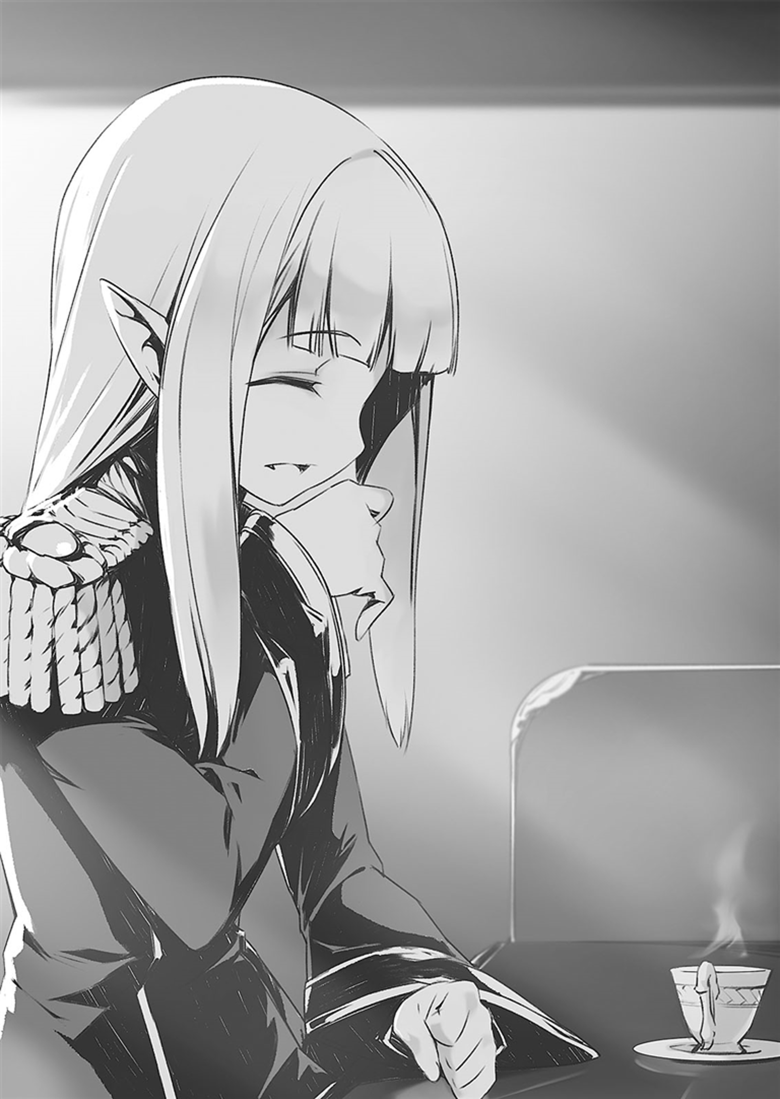 1girl character_request closed_eyes cup female_focus highres konjiki_no_moji_tsukai long_earlobes long_hair long_sleeves military_uniform monochrome novel_illustration official_art open_mouth pointy_ears smile solo solo_focus sumaki_shungo teacup