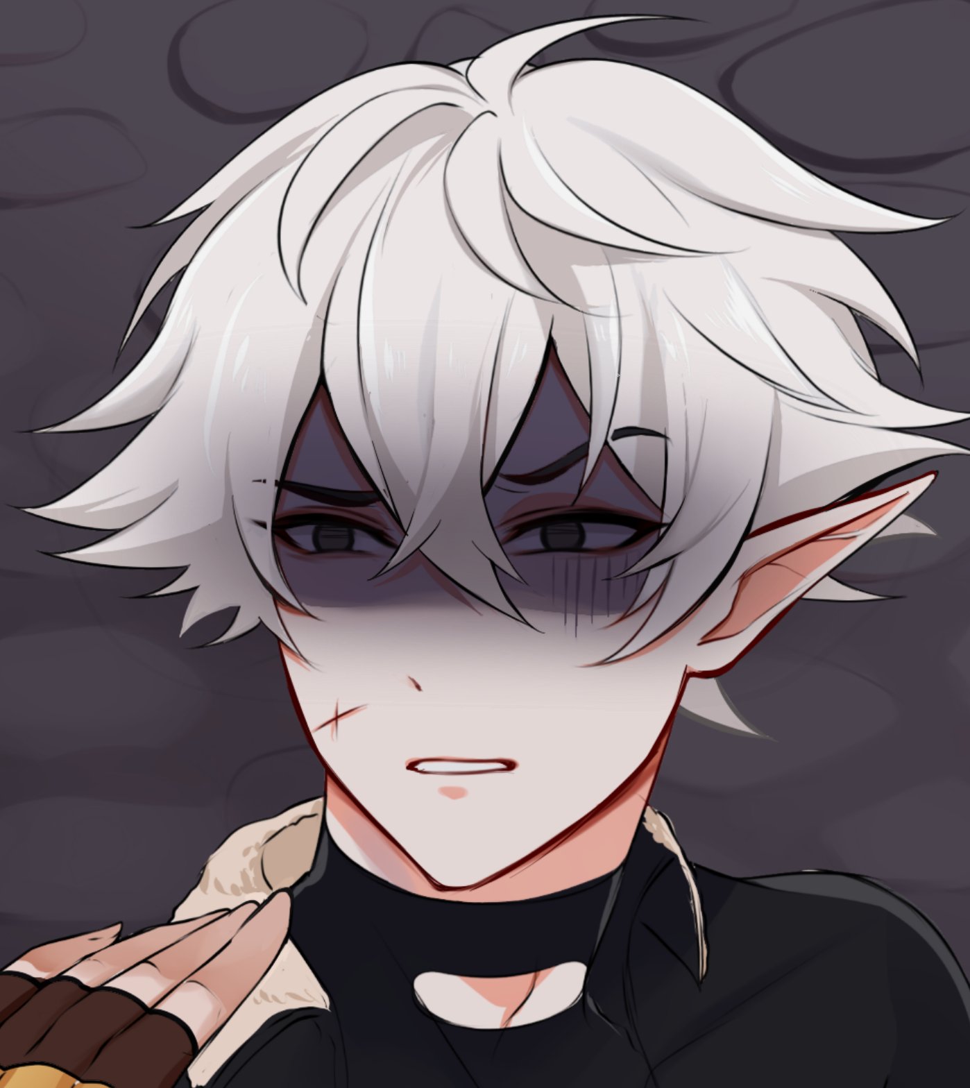 1boy 1hp_club 1other alice_(1hp_club) black_eyes cross_scar crossed_bangs double-parted_bangs elfboiii hair_between_eyes highres obi_(1hp_club) out_of_frame partially_shaded_face pointy_ears portrait pov pov_hands raised_eyebrow scar scar_on_face short_hair white_hair