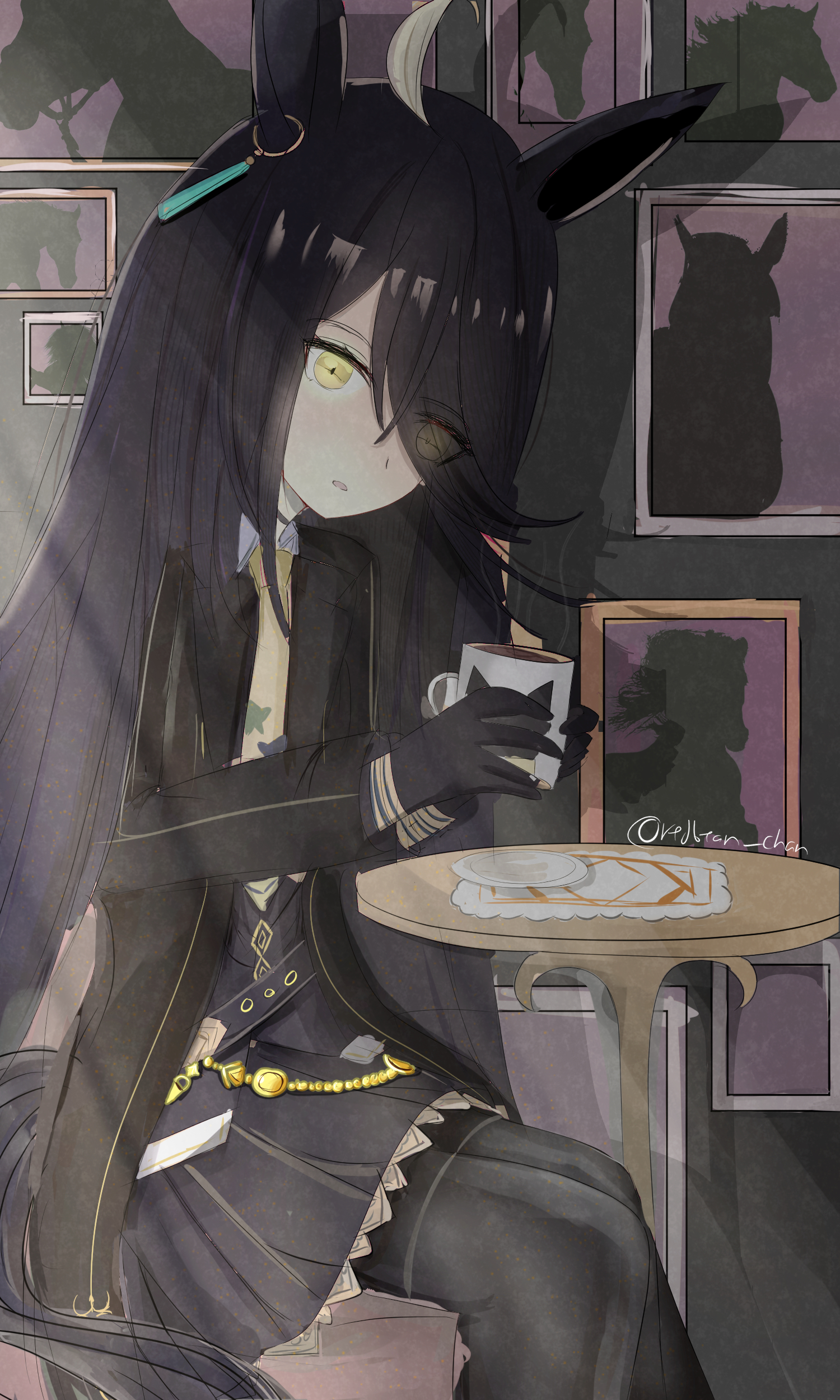 1girl absurdres animal_ears animal_print belt black_belt black_gloves black_hair black_pantyhose black_skirt black_vest cat_print cup ear_ornament ear_tag earrings expressionless eyes_visible_through_hair frilled_skirt frills gloves hair_over_one_eye hands_up hem_peeking_out highres holding holding_cup horse horse_ears horse_girl horse_tail jewelry long_bangs long_hair manhattan_cafe_(umamusume) mug necktie pantyhose parted_lips picture_frame pleated_skirt redbean_chan shirt single_earring sitting skirt solo table tail umamusume very_long_hair vest white_shirt yellow_eyes yellow_necktie